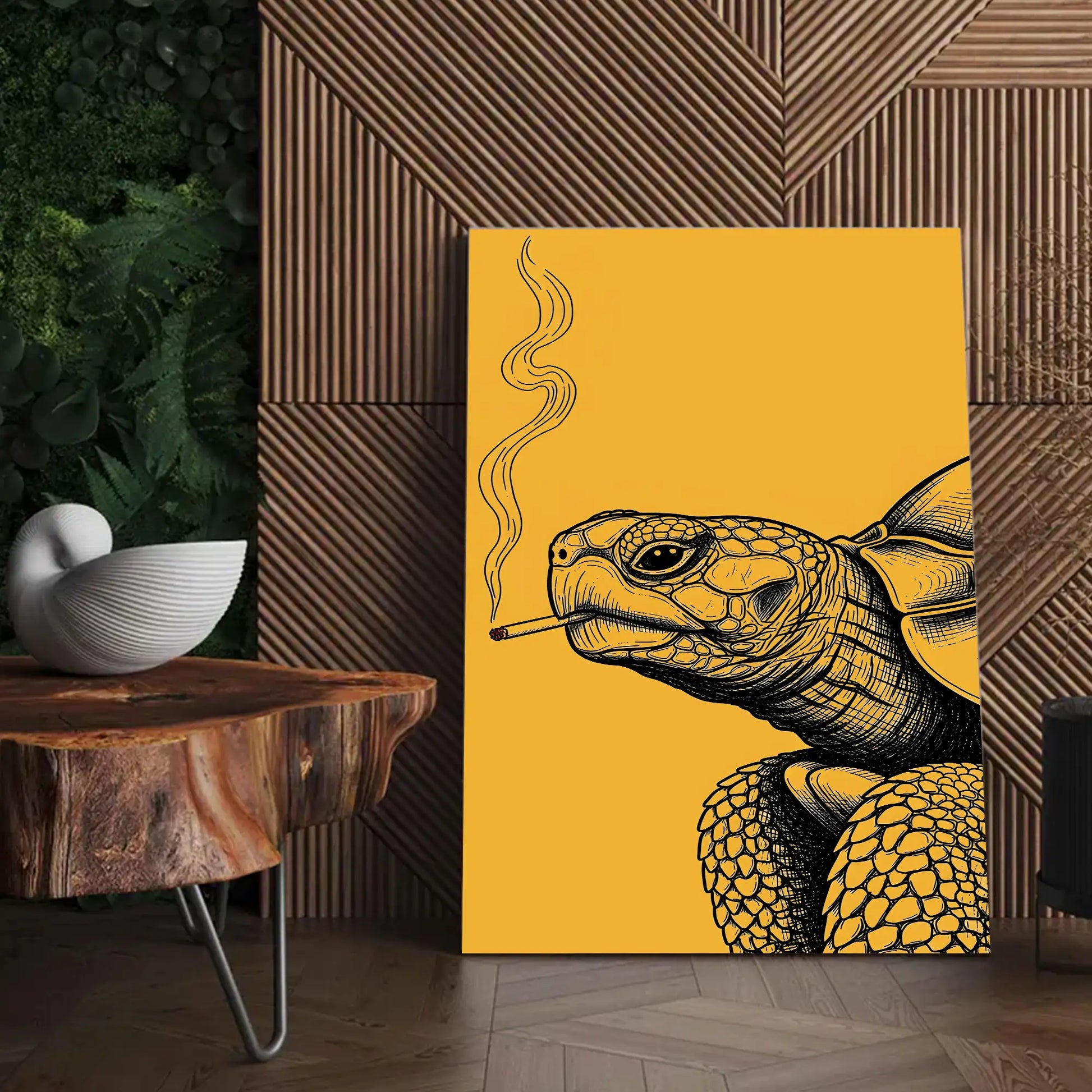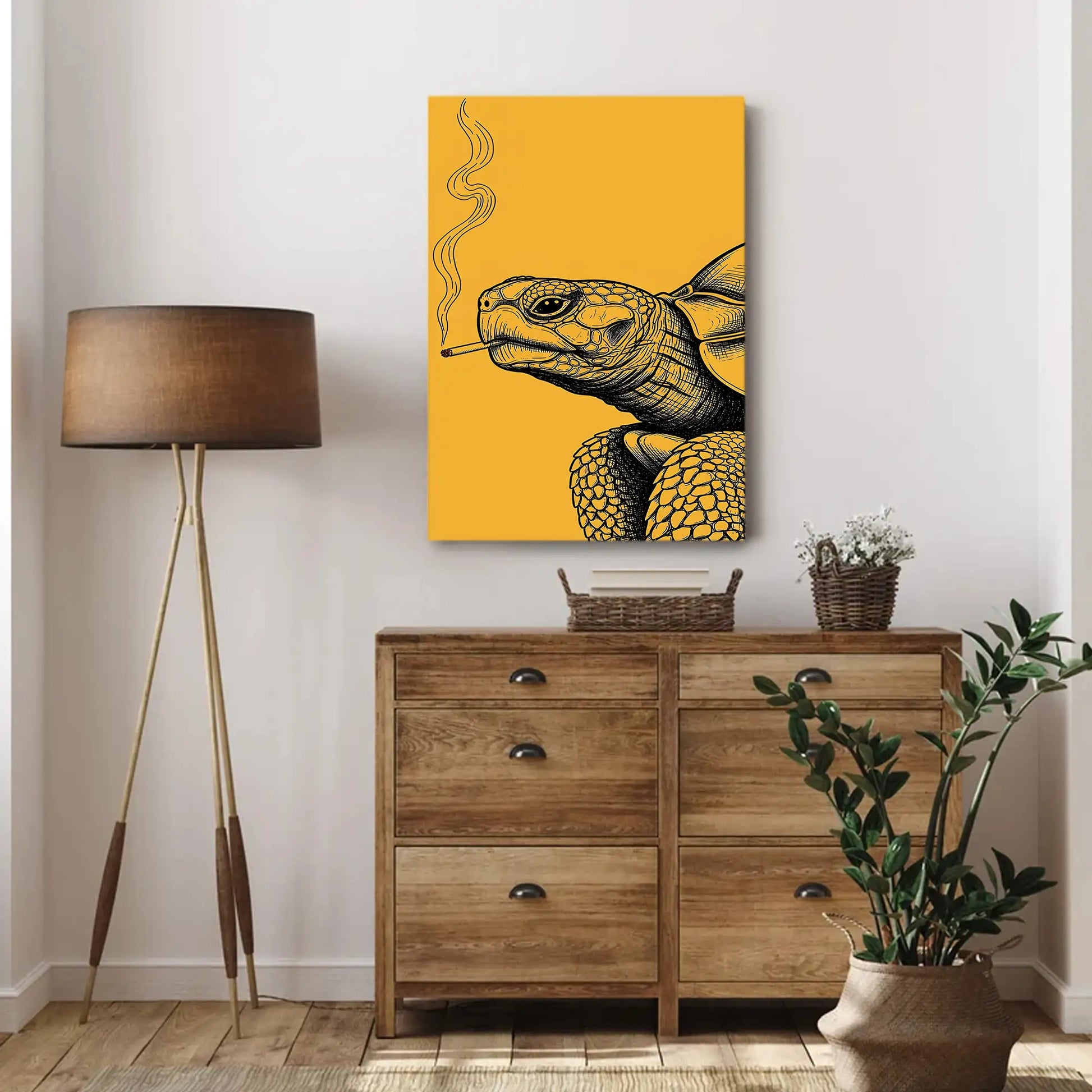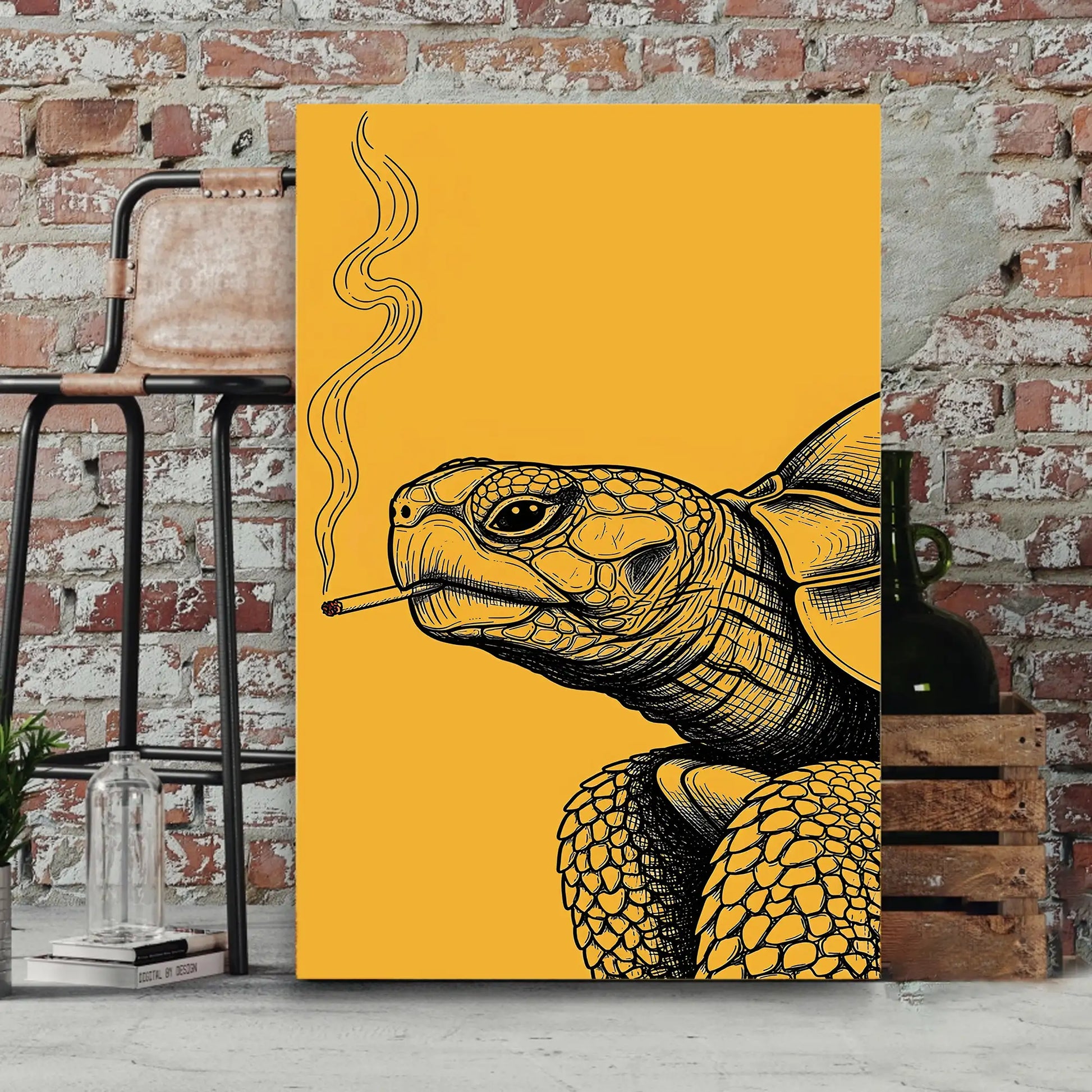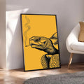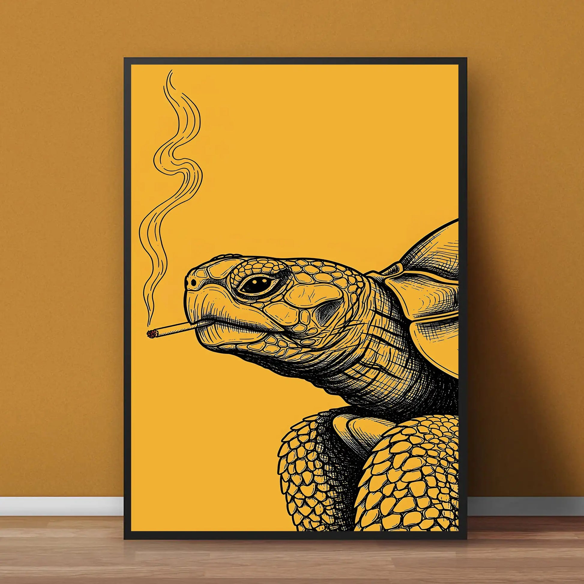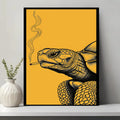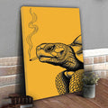 This unique wall art features a turtle illustrated with intricate black linework against a bold golden background, holding a cigarette with smoke rising upward. In tribal traditions, the turtle is a revered symbol of longevity, wisdom, and connection to the earth. Many stories from tribes of the Great Lakes describe the turtle as carrying the world upon its back, embodying stability and endurance. This artwork adds a rebellious twist to that sacred imagery, turning the turtle into a striking modern statement. Perfect for rustic homes, eclectic interiors, or creative spaces, this canvas blends cultural depth with bold contemporary design.