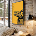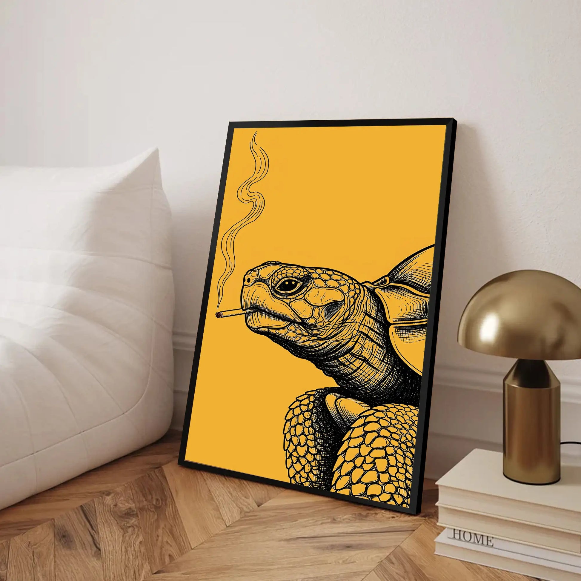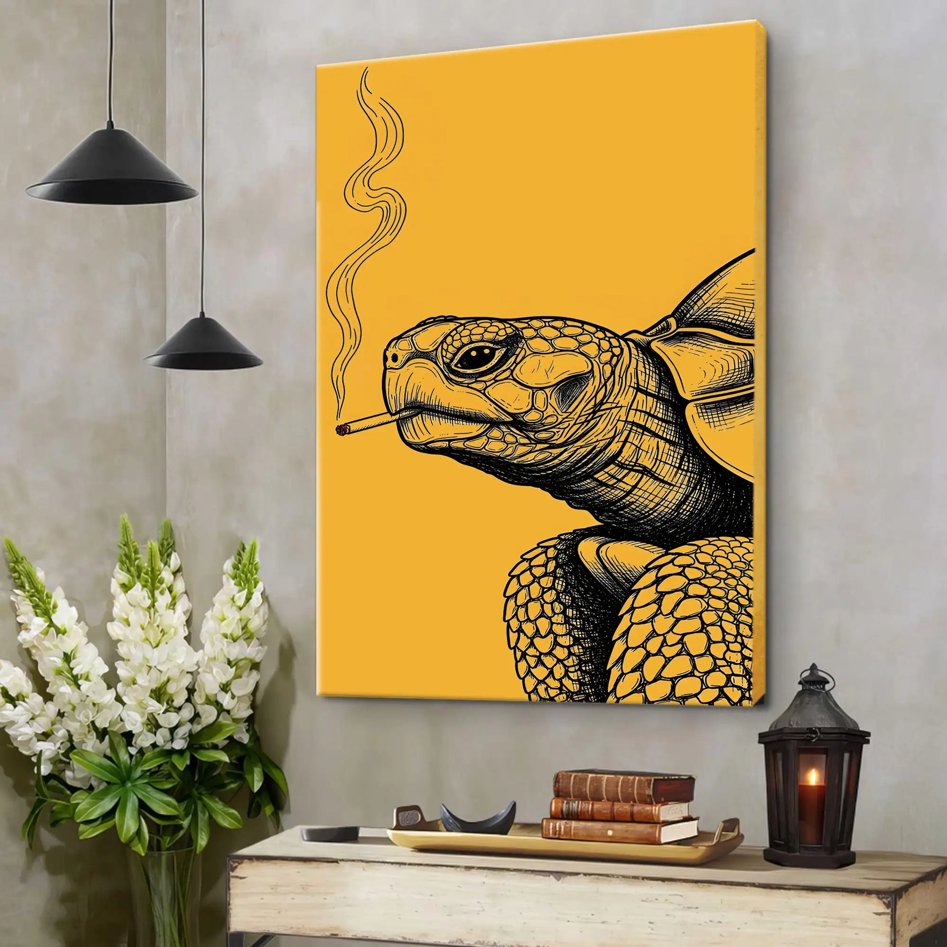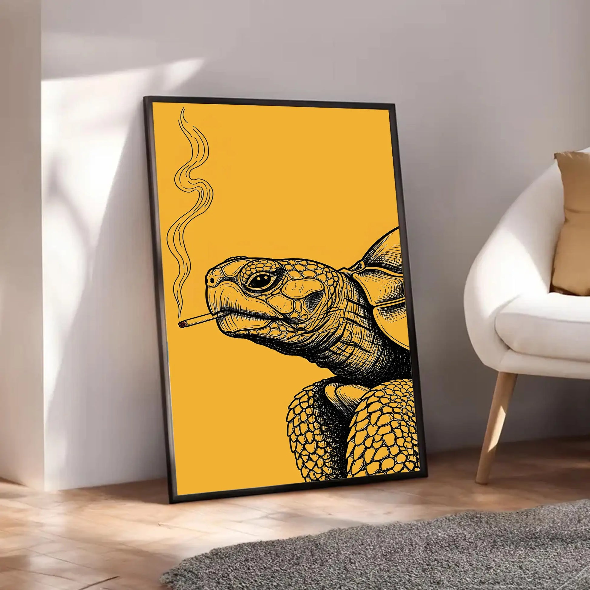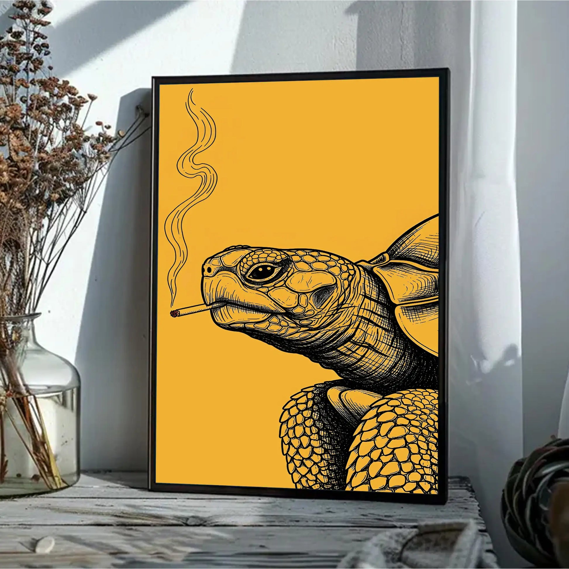 This unique wall art features a turtle illustrated with intricate black linework against a bold golden background, holding a cigarette with smoke rising upward. In tribal traditions, the turtle is a revered symbol of longevity, wisdom, and connection to the earth. Many stories from tribes of the Great Lakes describe the turtle as carrying the world upon its back, embodying stability and endurance. This artwork adds a rebellious twist to that sacred imagery, turning the turtle into a striking modern statement. Perfect for rustic homes, eclectic interiors, or creative spaces, this canvas blends cultural depth with bold contemporary design.