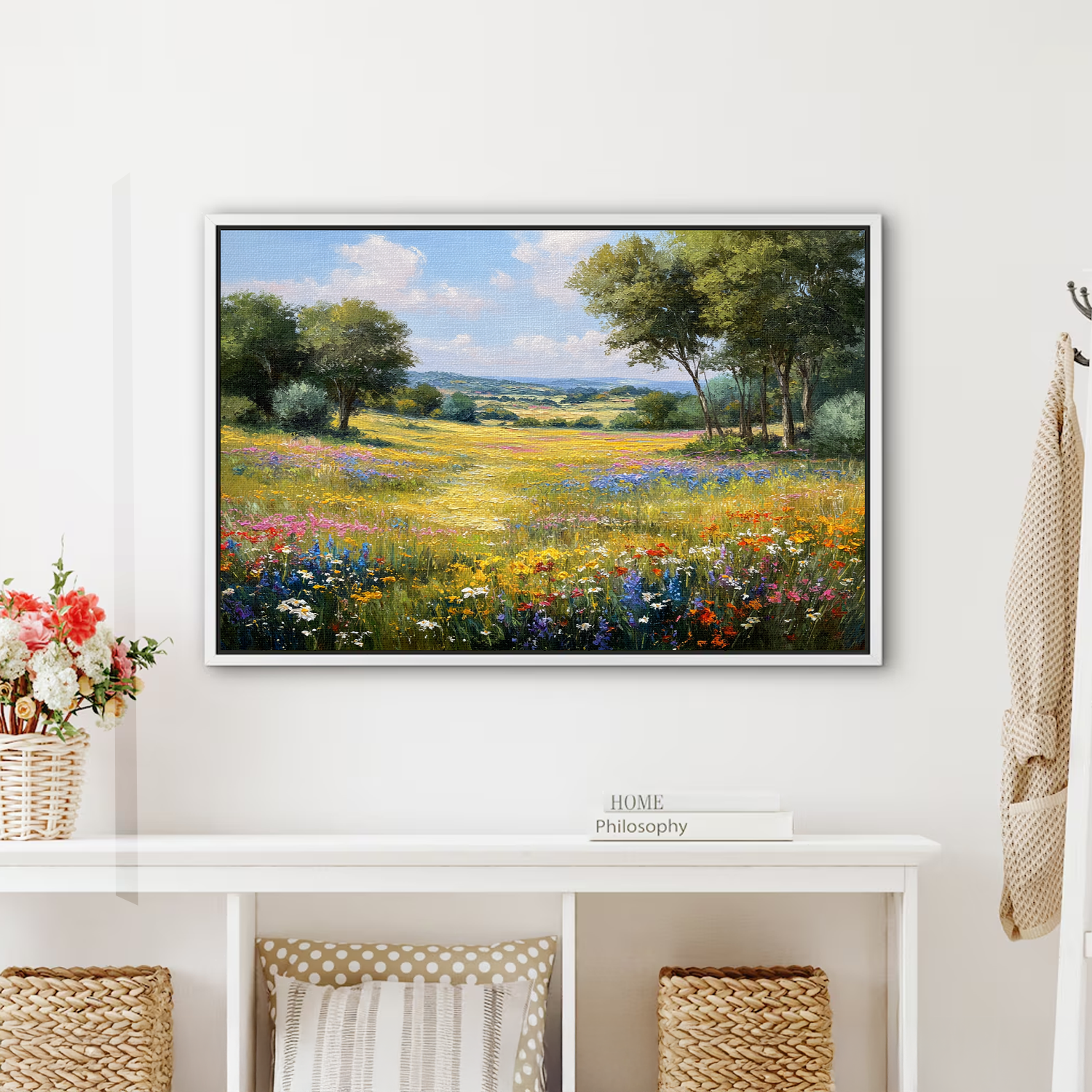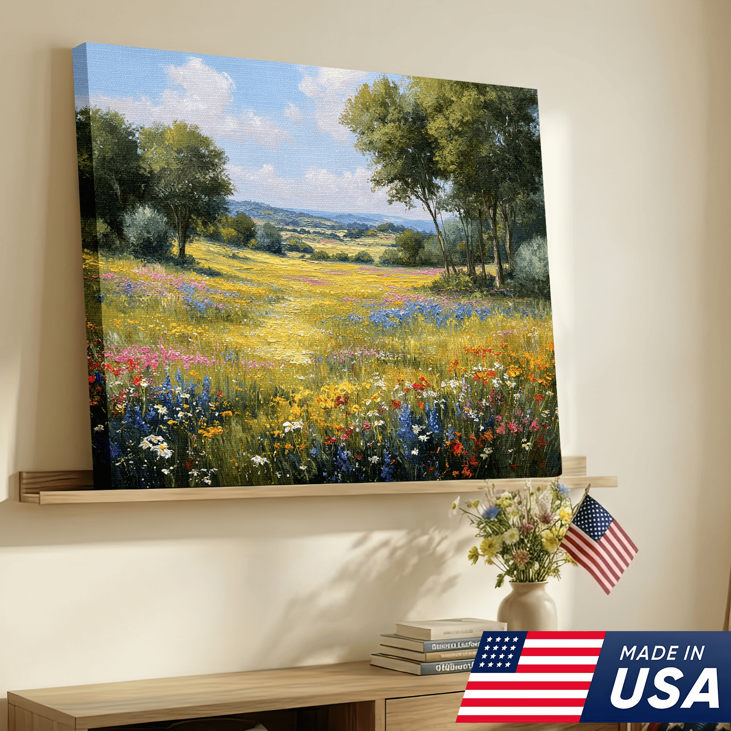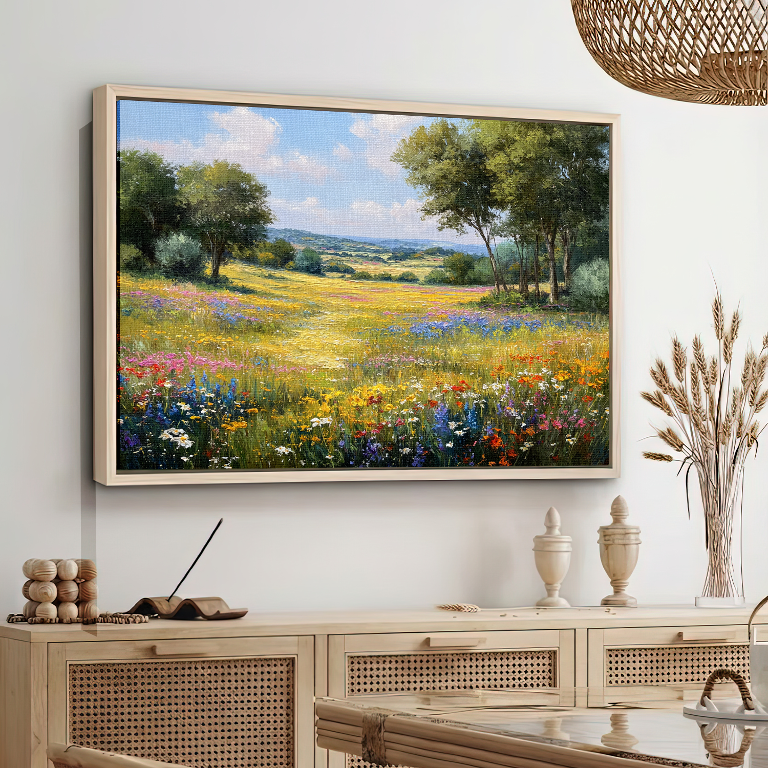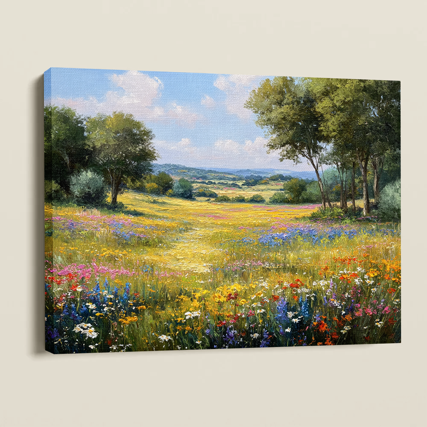 Sunlit Valley Floral Landscape Framed Canvas β Pastoral Bloom
