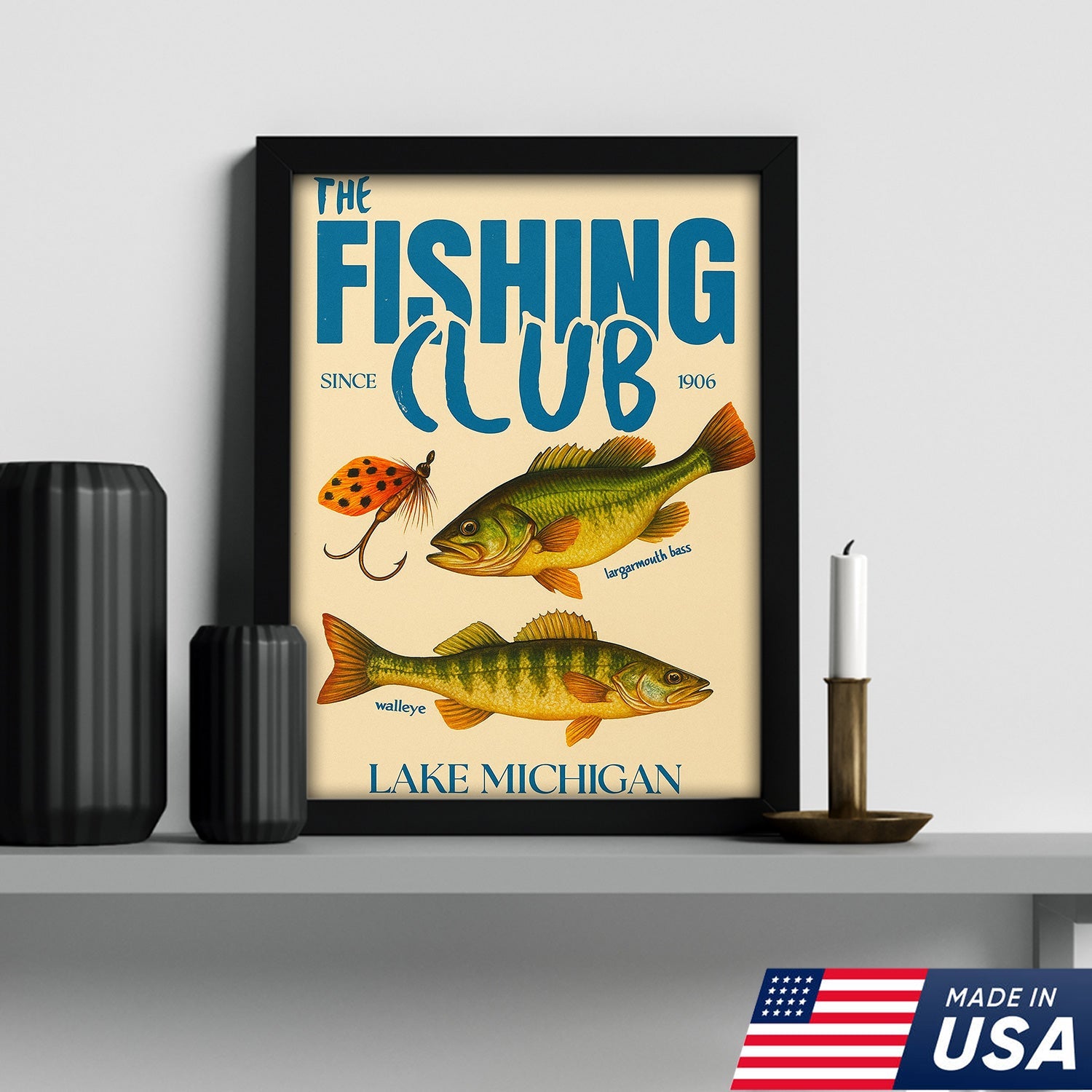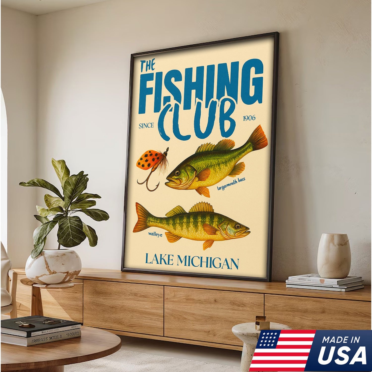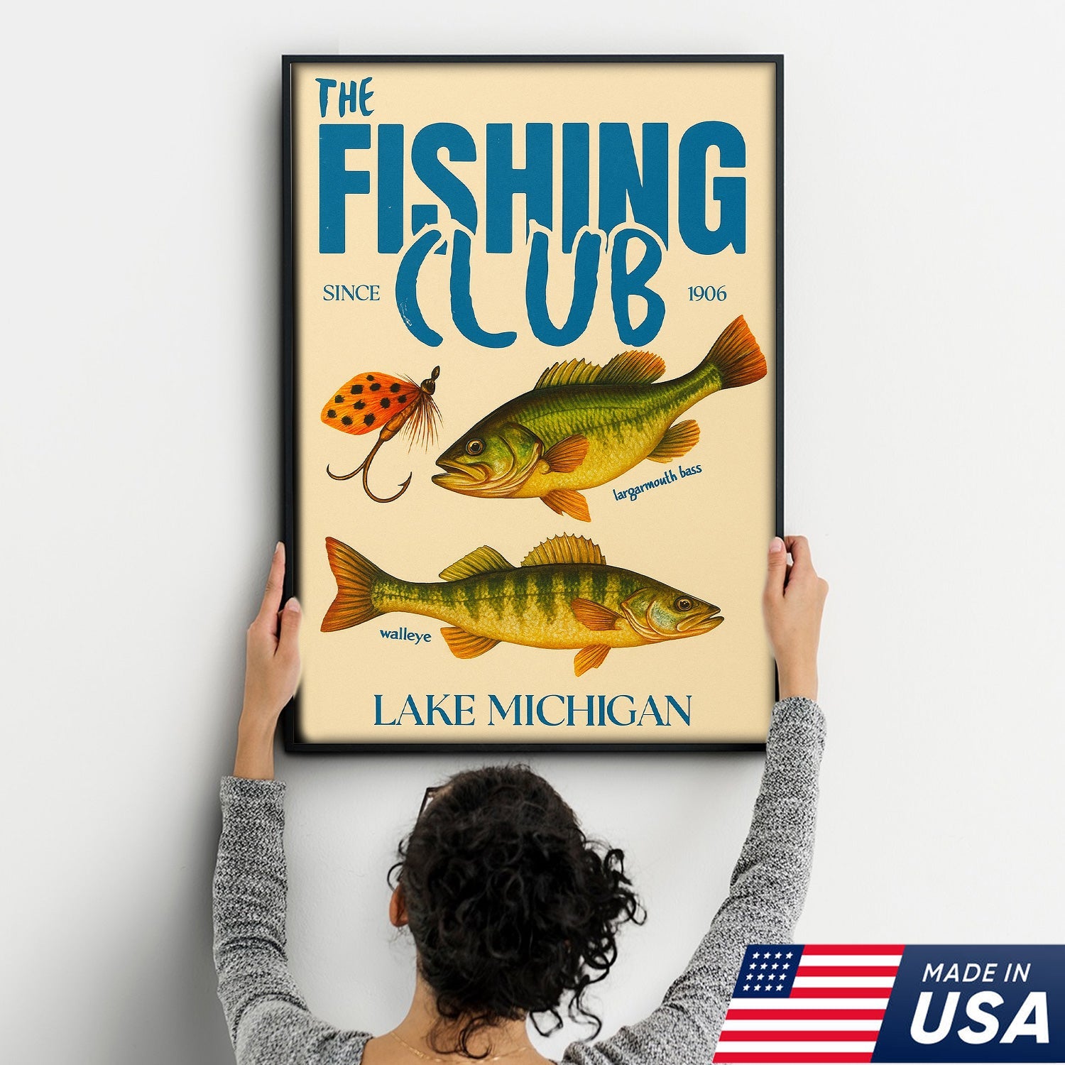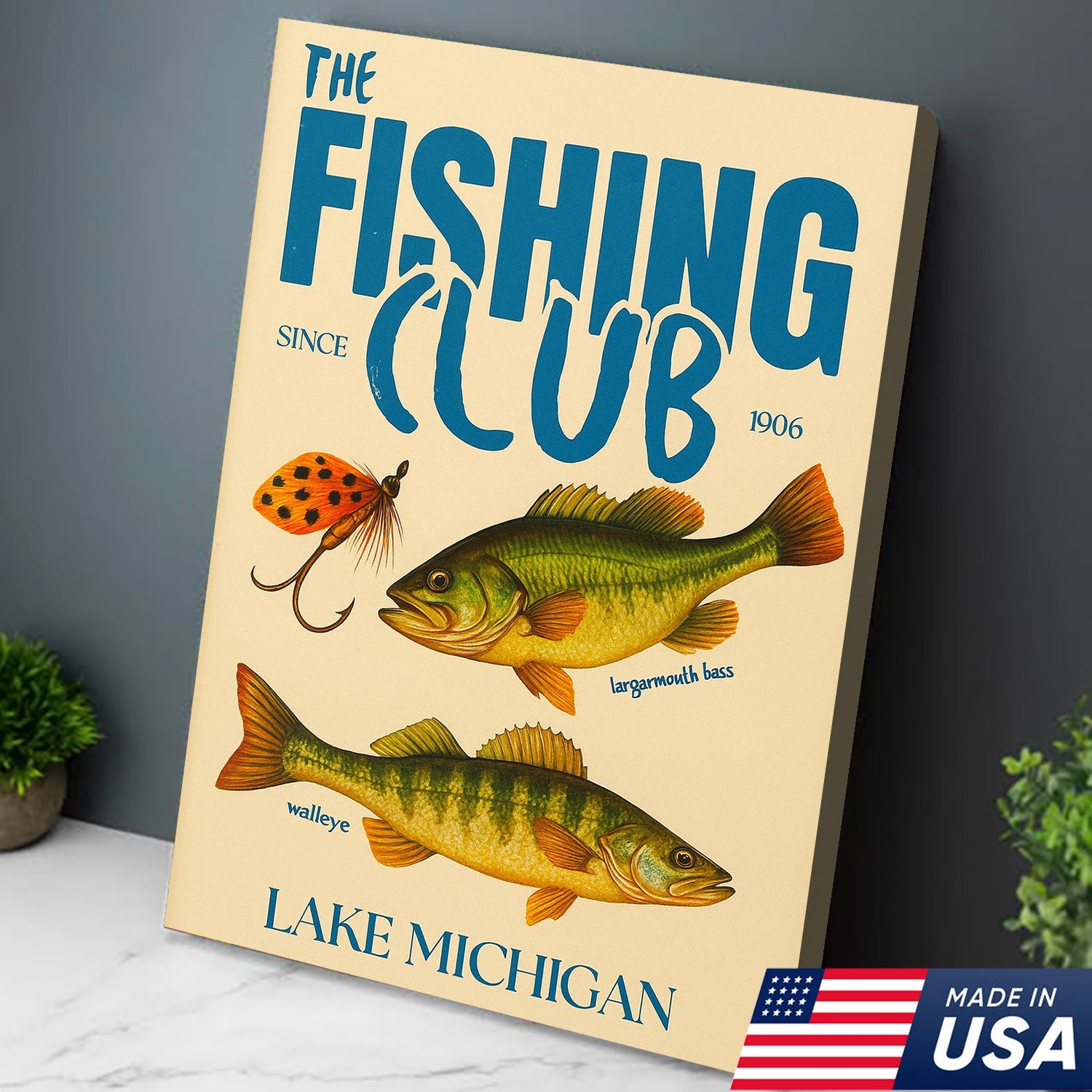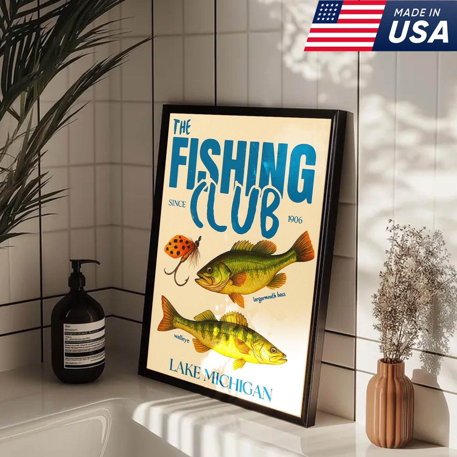 The Fishing Club Retro Wall Art – Vintage Lake Michigan Sign for Fishermen & Cabin Decor