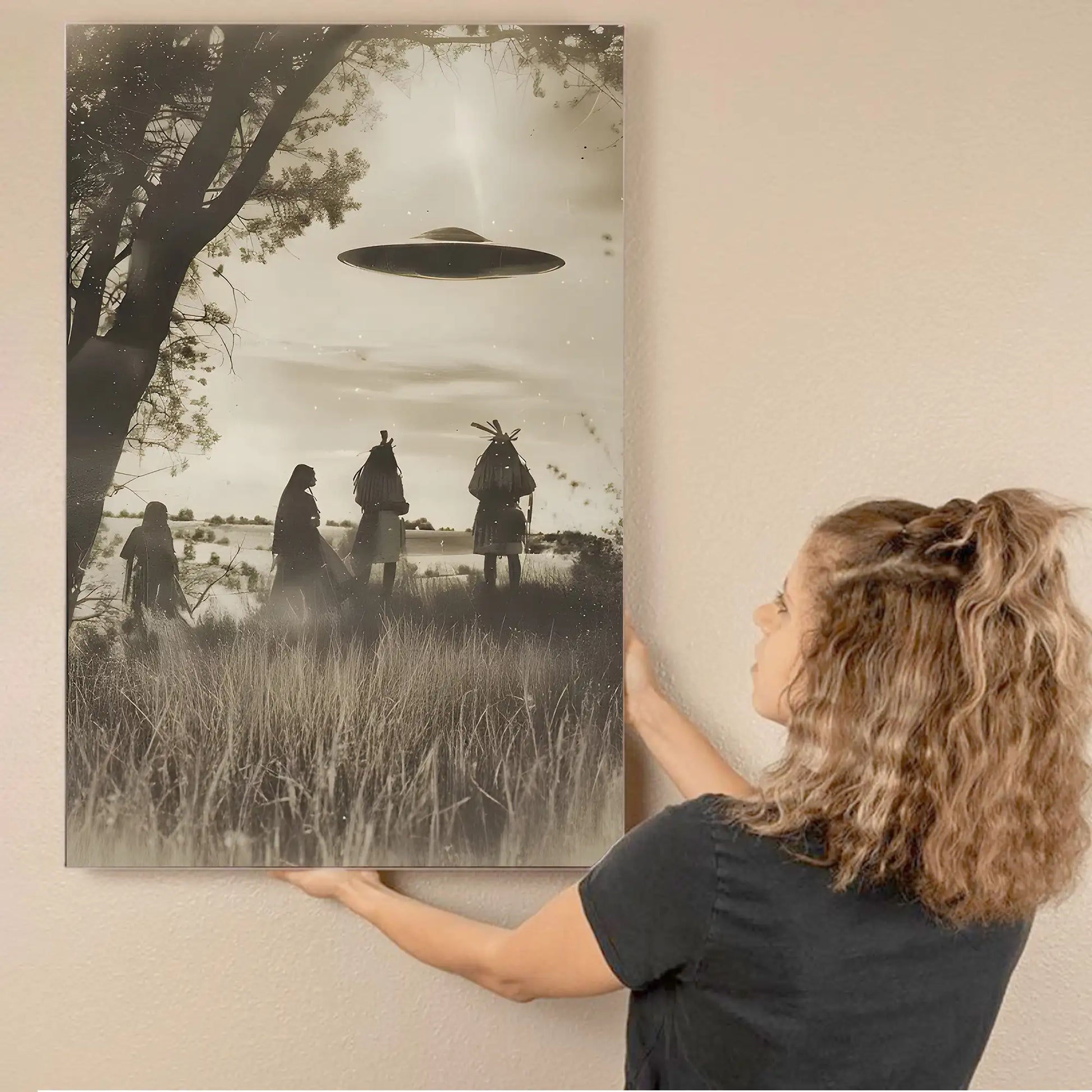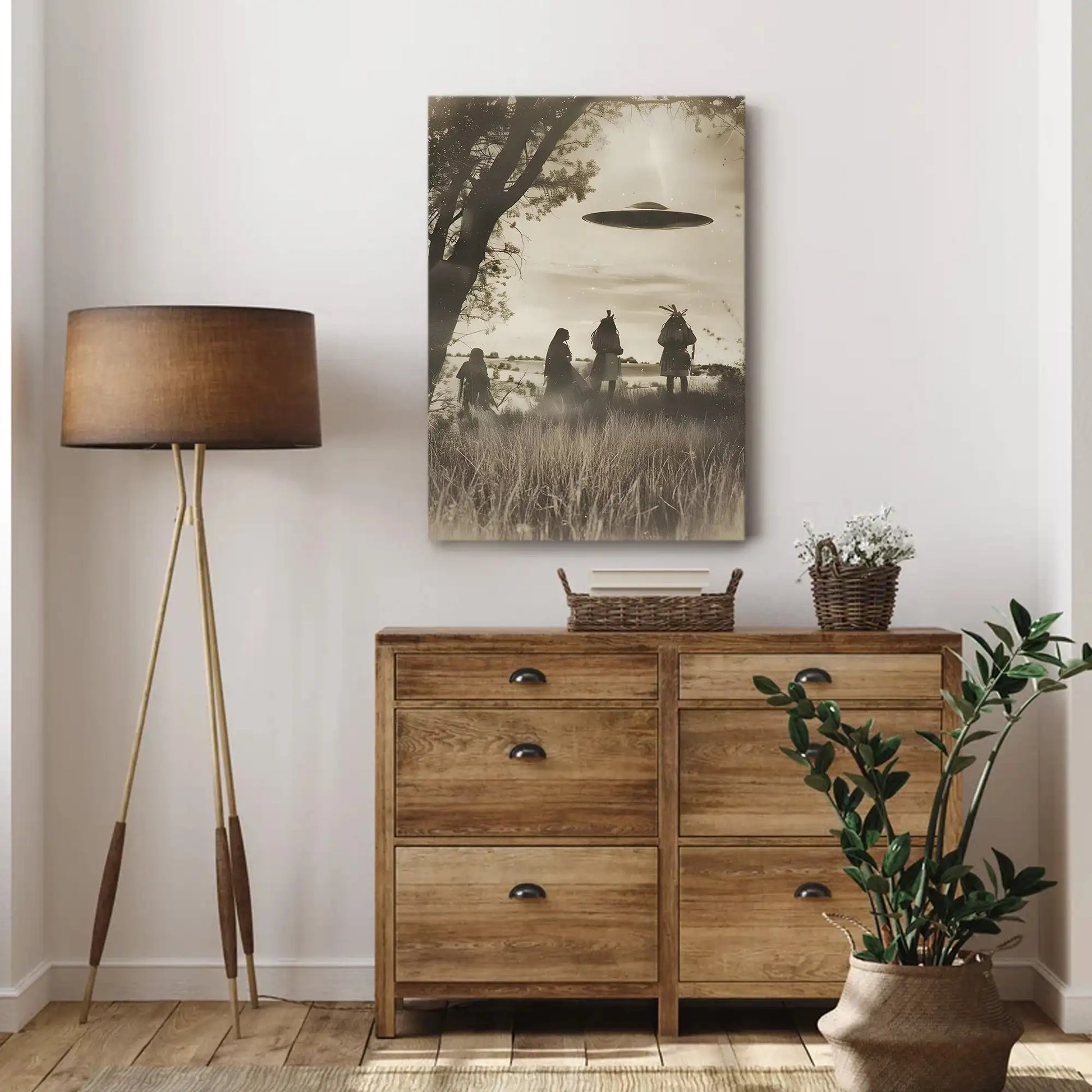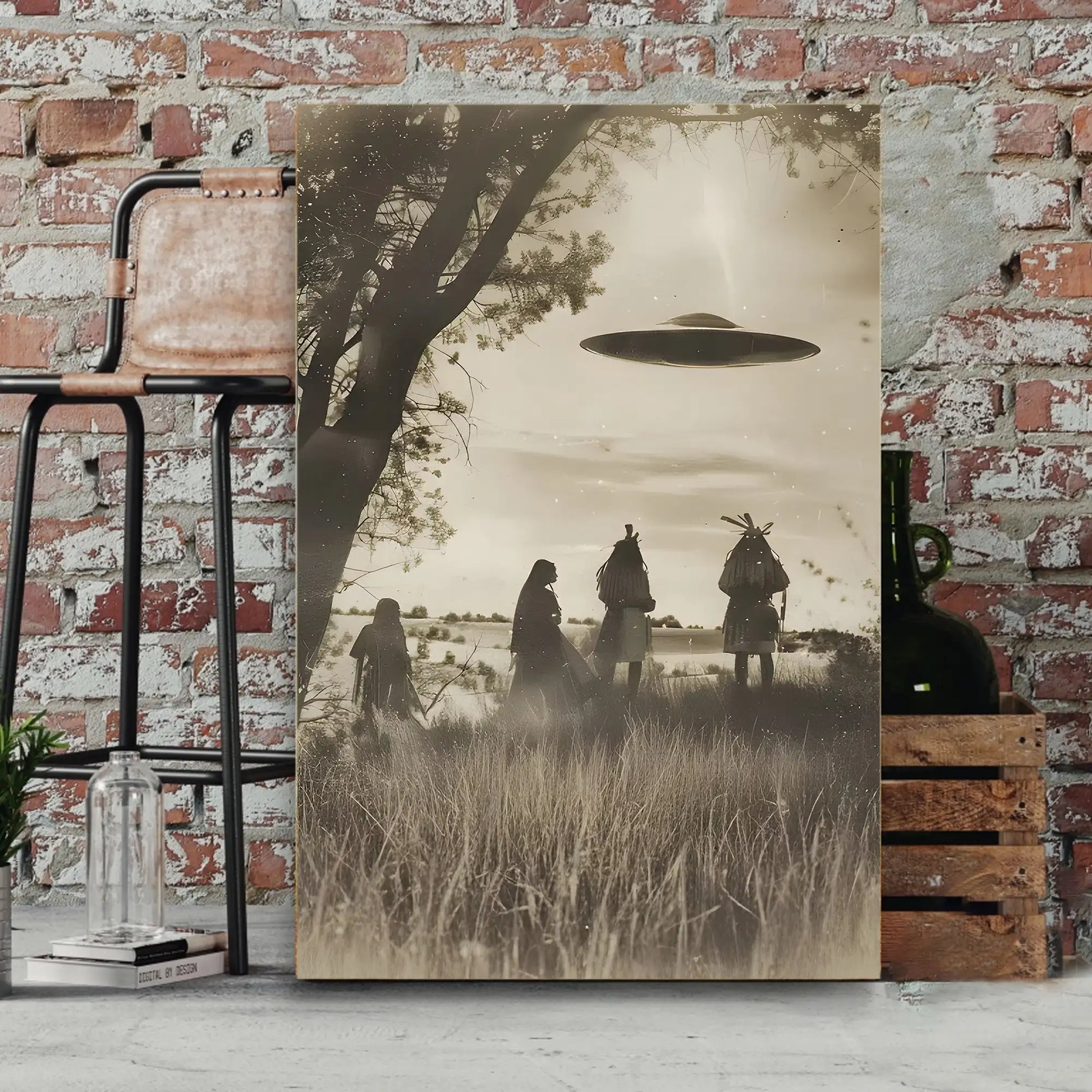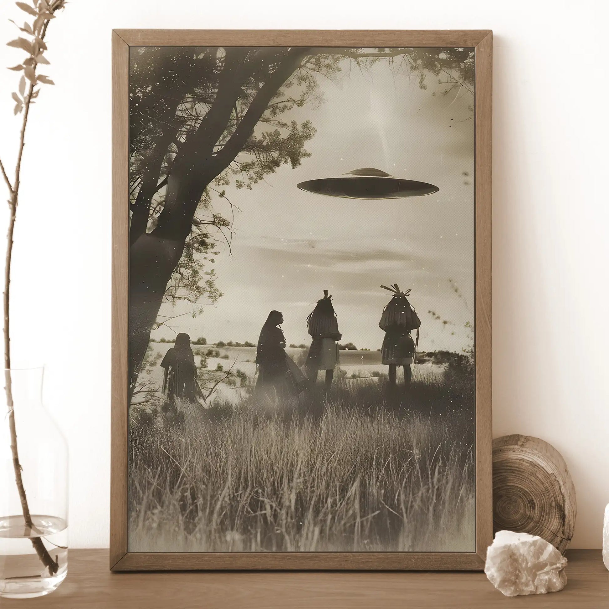 This intriguing wall art combines cultural imagery with a mysterious twist, depicting tribal figures standing in open fields as a UFO hovers silently above. Rendered in sepia tones with vintage textures, the artwork bridges tradition and cosmic wonder, inviting viewers to reflect on stories that transcend time and space. The silhouettes of the figures evoke resilience and connection to land, while the otherworldly craft introduces an element of curiosity and myth. Perfect for those who appreciate both cultural depth and science fiction themes, this canvas adds a bold, thought-provoking accent to any living room, office, or creative space.