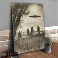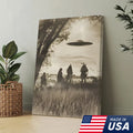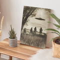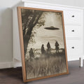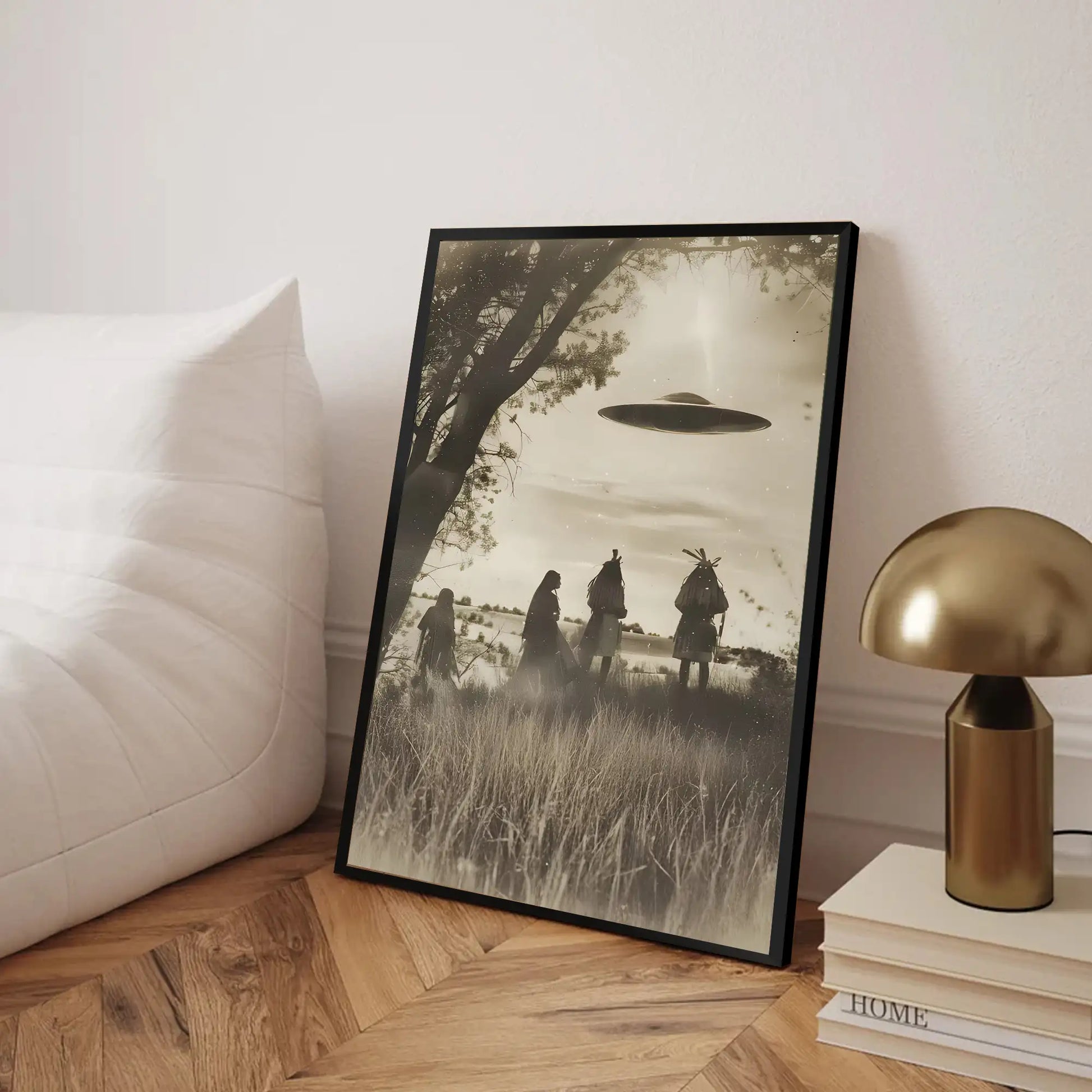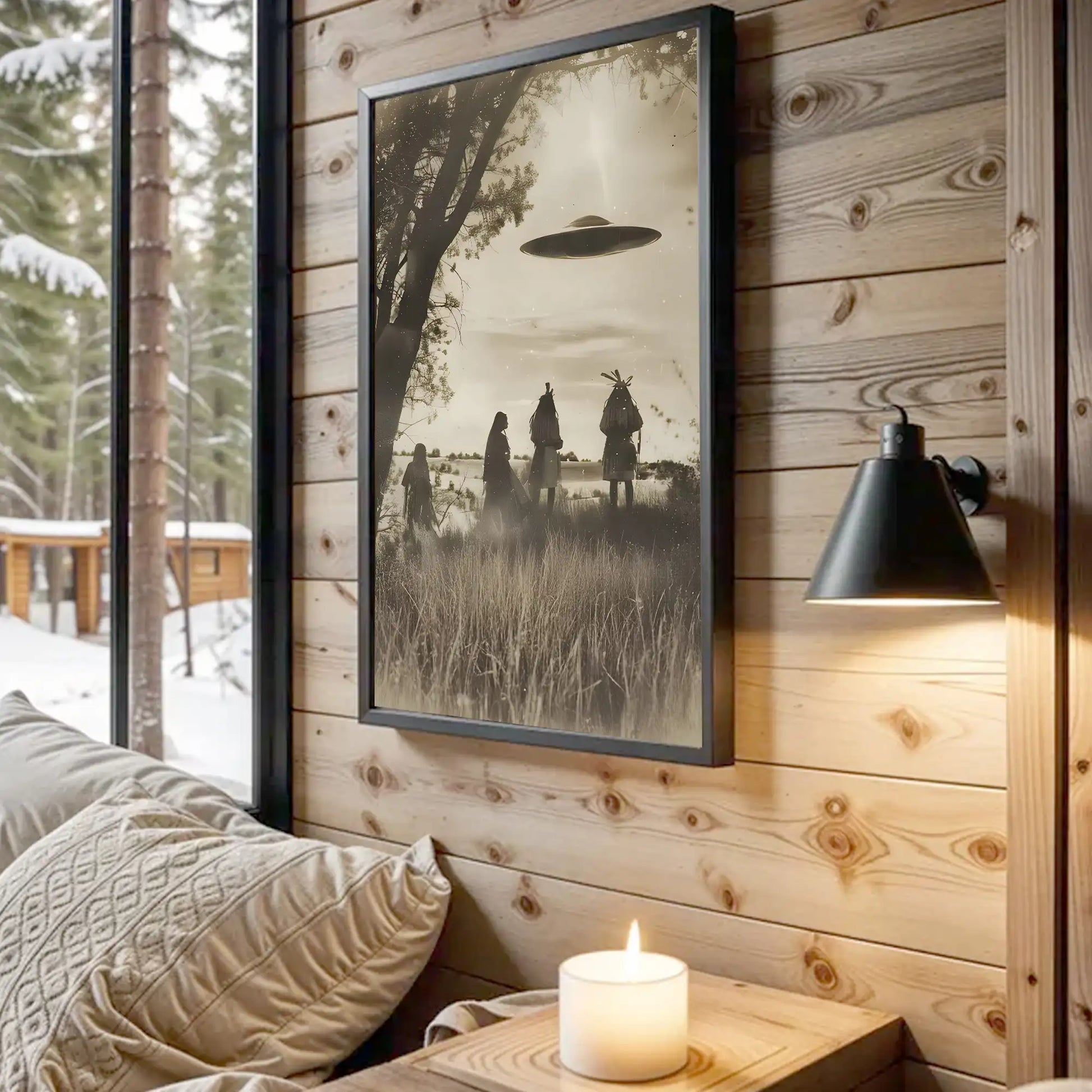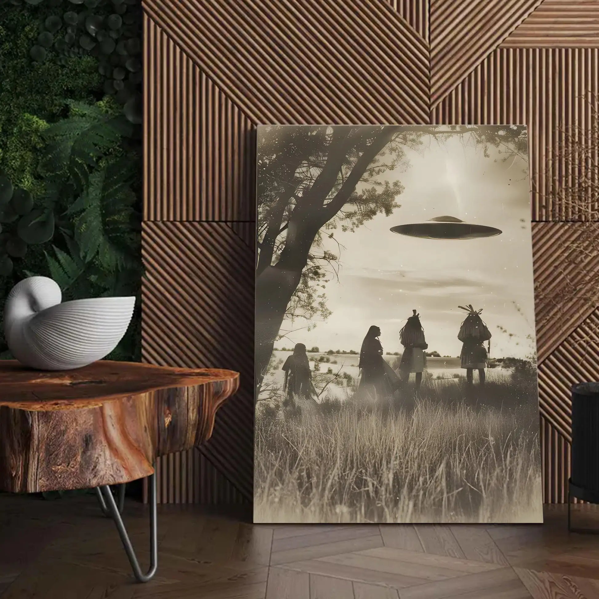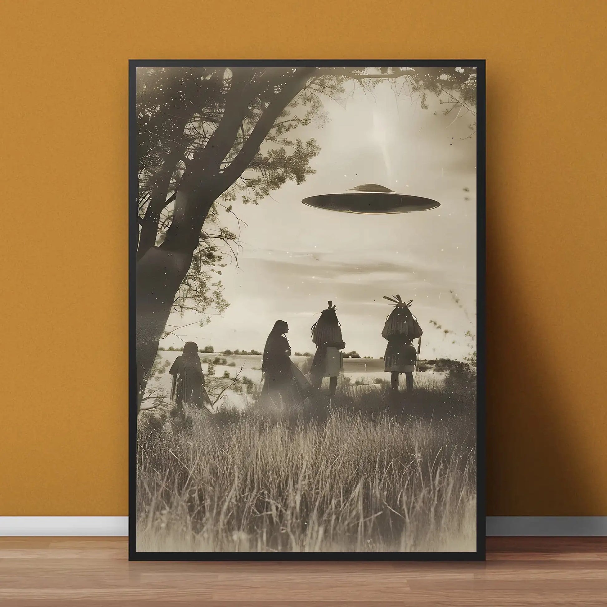 This intriguing wall art combines cultural imagery with a mysterious twist, depicting tribal figures standing in open fields as a UFO hovers silently above. Rendered in sepia tones with vintage textures, the artwork bridges tradition and cosmic wonder, inviting viewers to reflect on stories that transcend time and space. The silhouettes of the figures evoke resilience and connection to land, while the otherworldly craft introduces an element of curiosity and myth. Perfect for those who appreciate both cultural depth and science fiction themes, this canvas adds a bold, thought-provoking accent to any living room, office, or creative space.