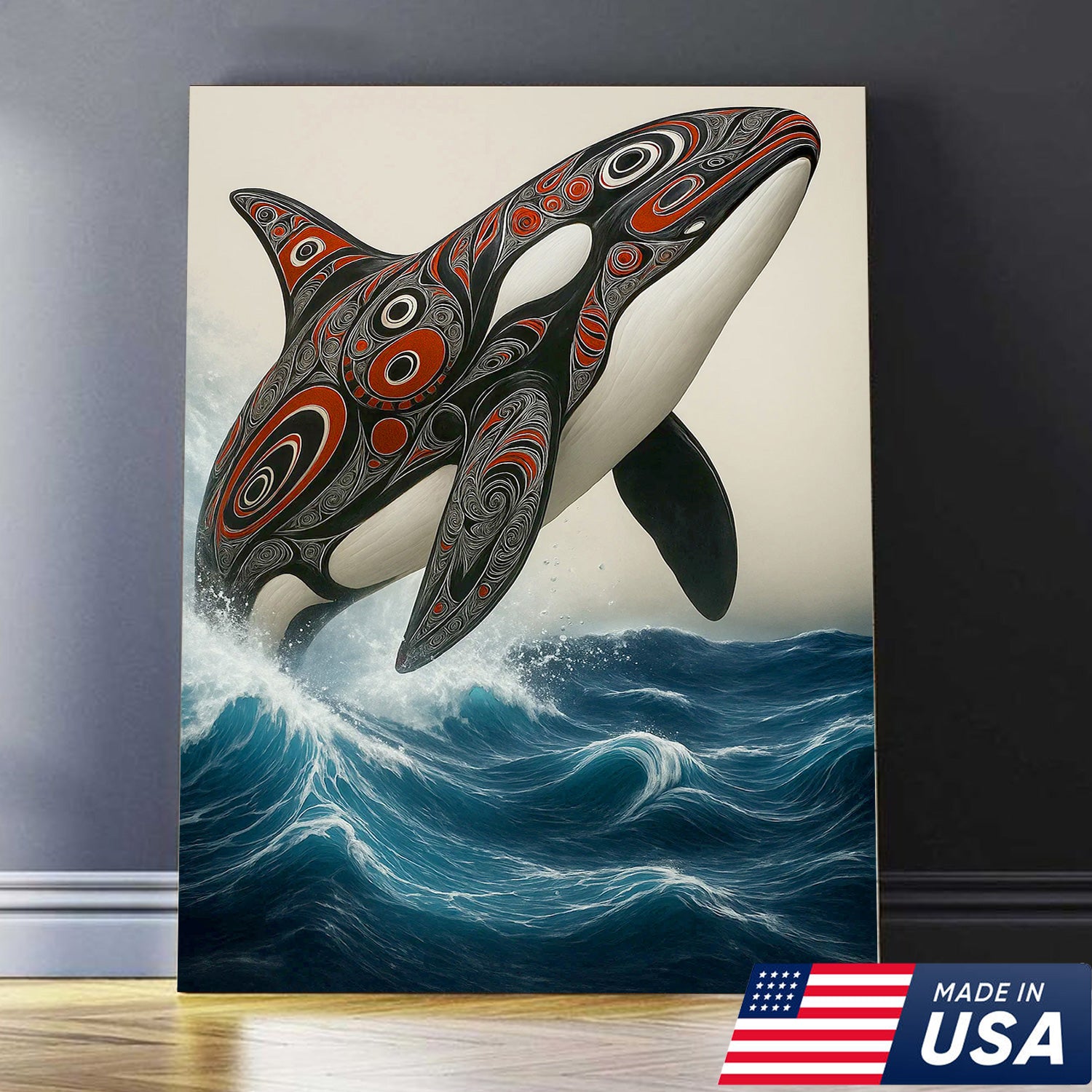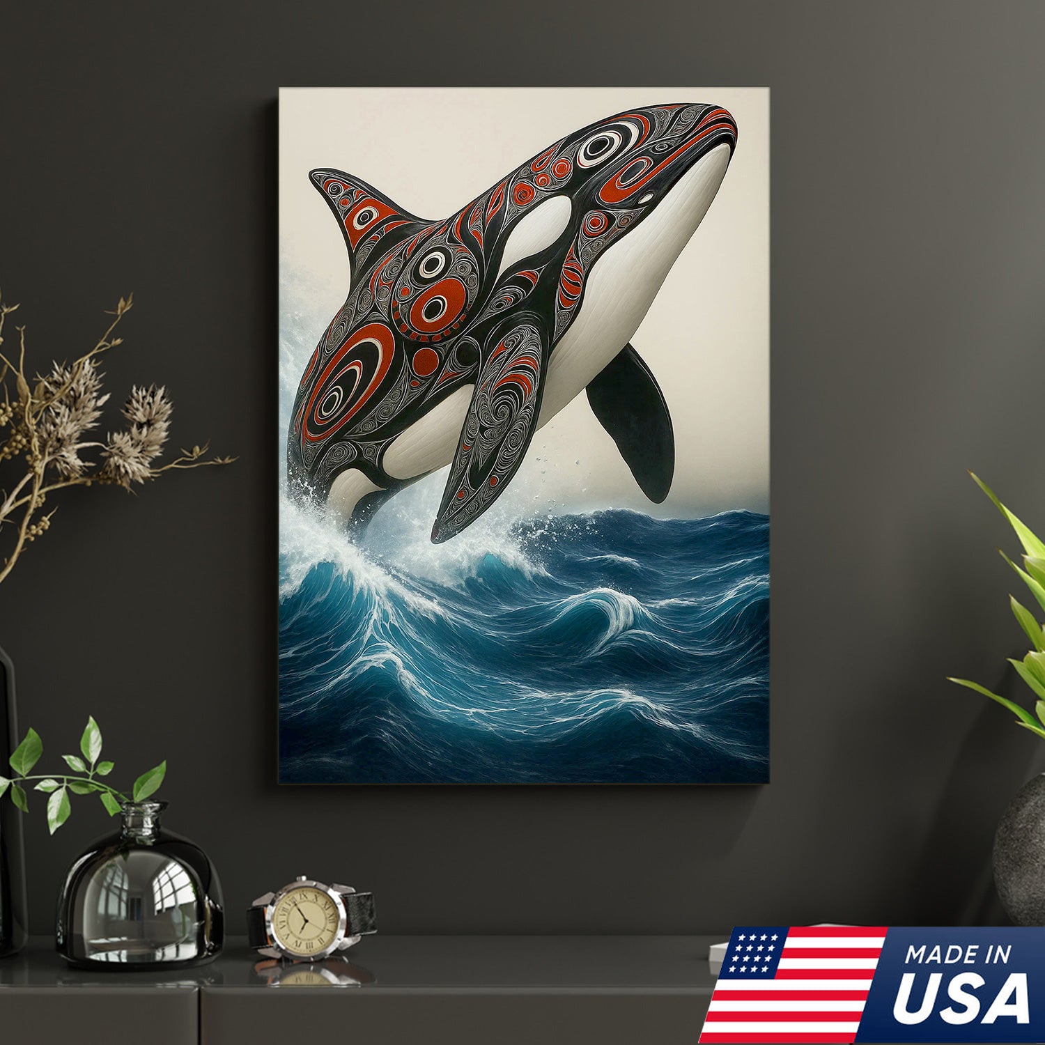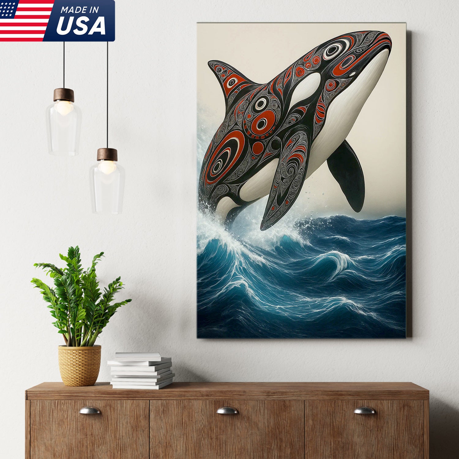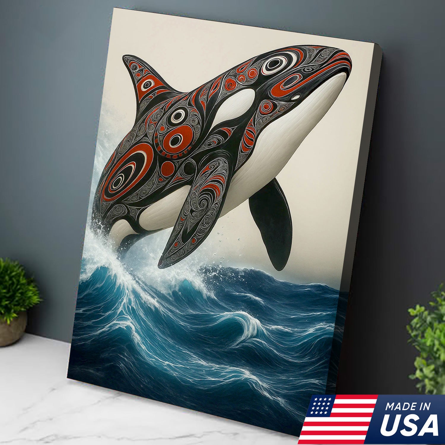 Tribal Orca Canvas Wall Art, Native American Killer Whale Spirit Design, Ocean Power Totem Symbol Coastal Decor