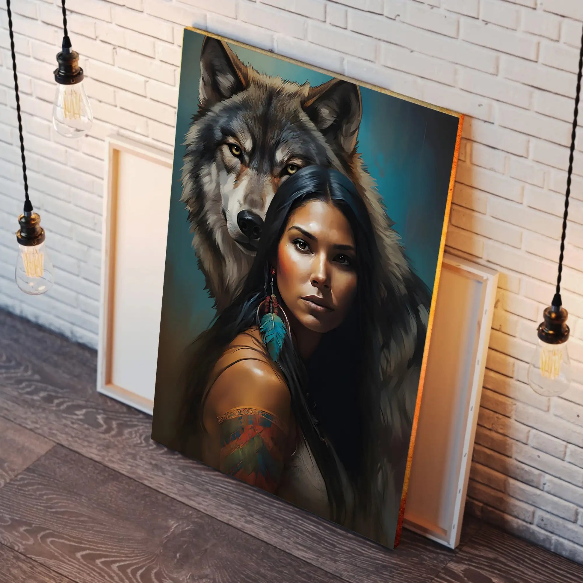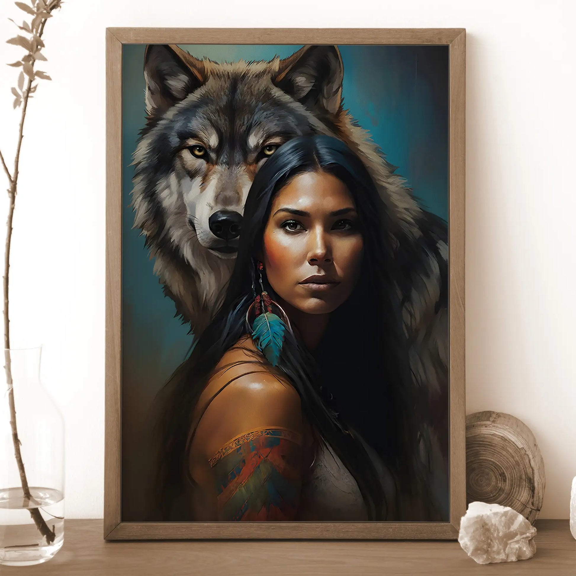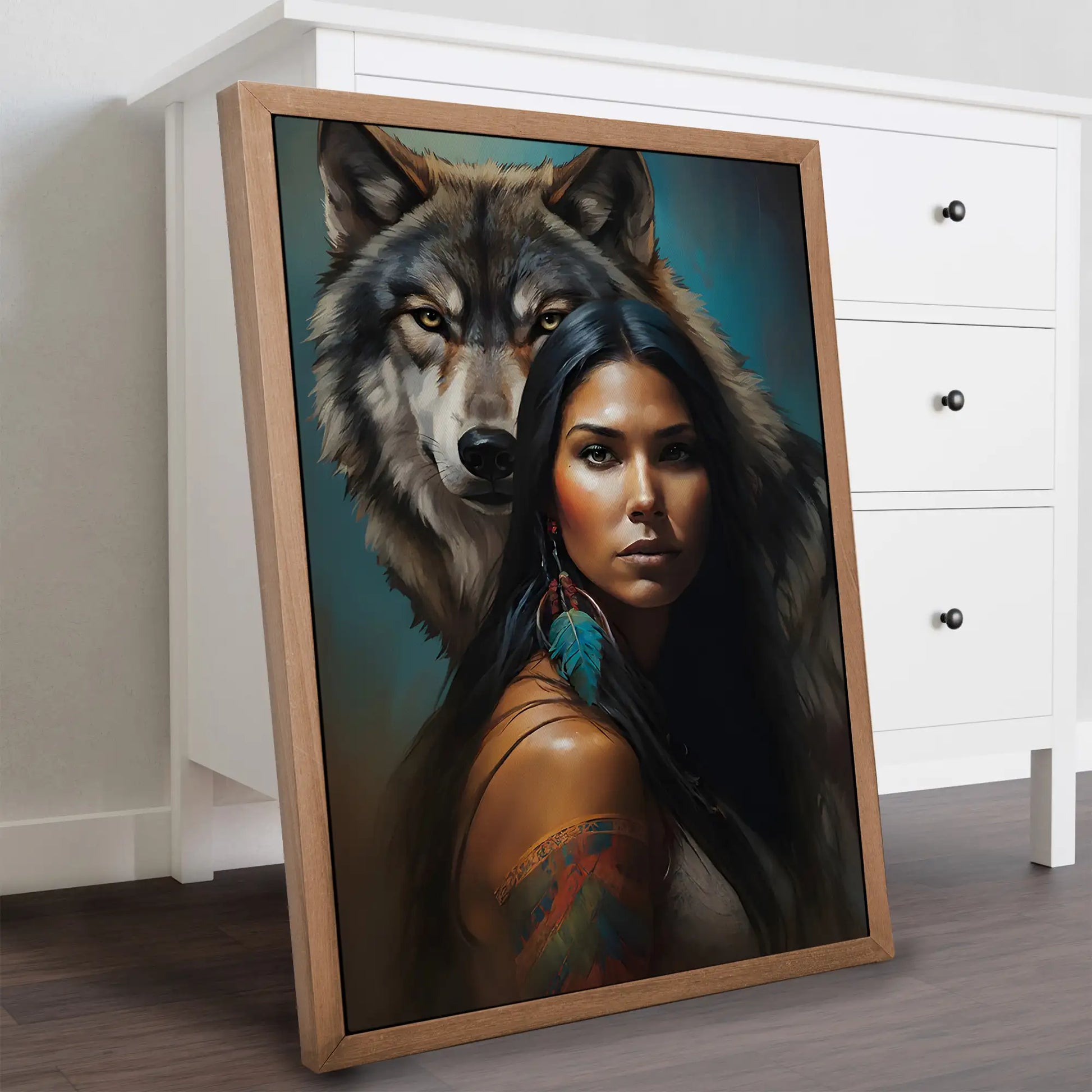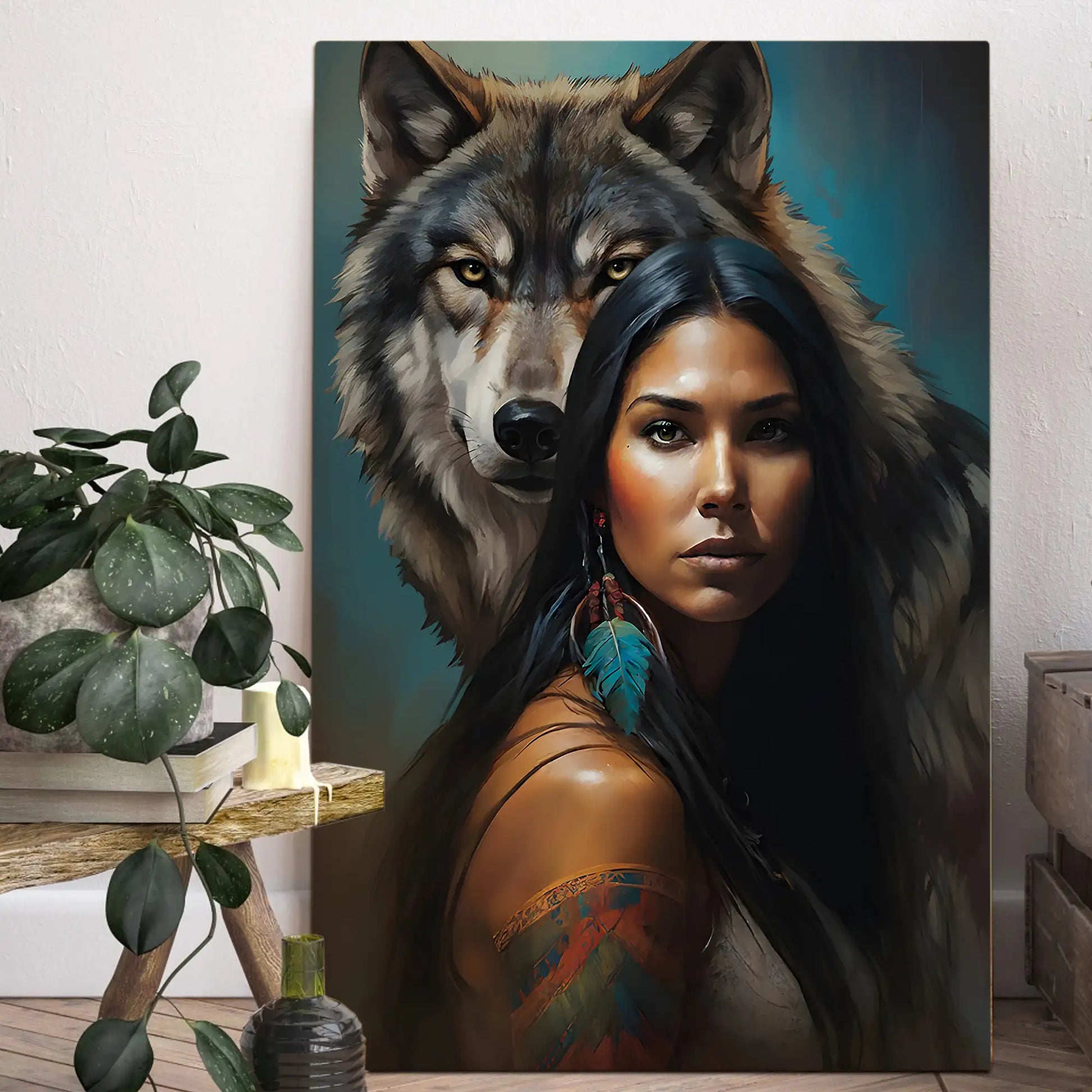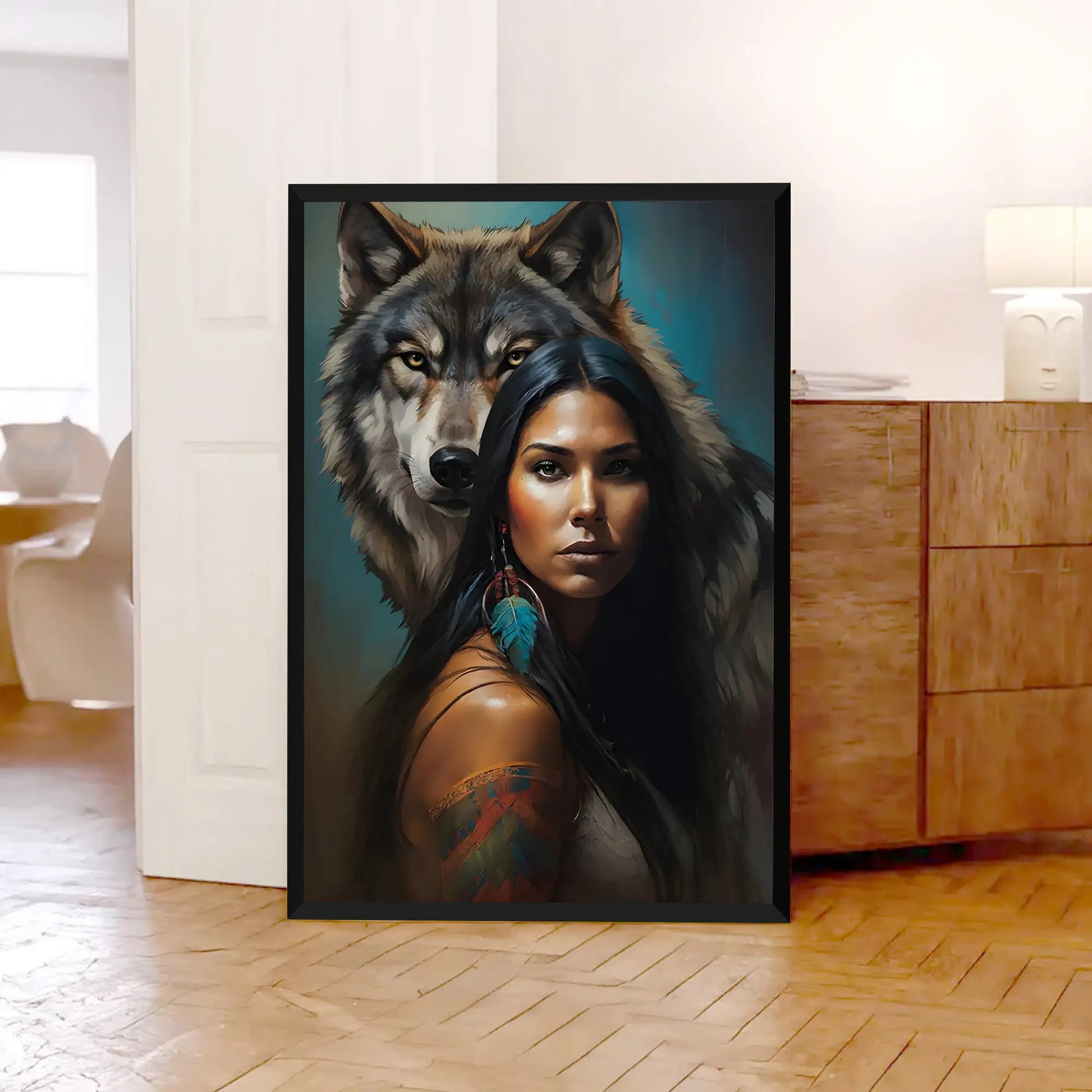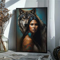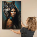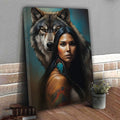 This striking wall art captures the powerful connection between a woman and the wolf spirit. The portrait features a confident woman with long black hair, adorned with traditional feathers and painted designs, standing before a majestic wolf whose gaze radiates loyalty and protection. Inspired by tribal symbolism, the wolf represents guidance, strength, and unity with nature, while the feather highlights cultural pride and spiritual wisdom. The detailed brushwork and vivid contrasts make this canvas more than decor—it is a statement of resilience and ancestral power. Perfect for living rooms, offices, or meditation spaces seeking meaning and inspiration.