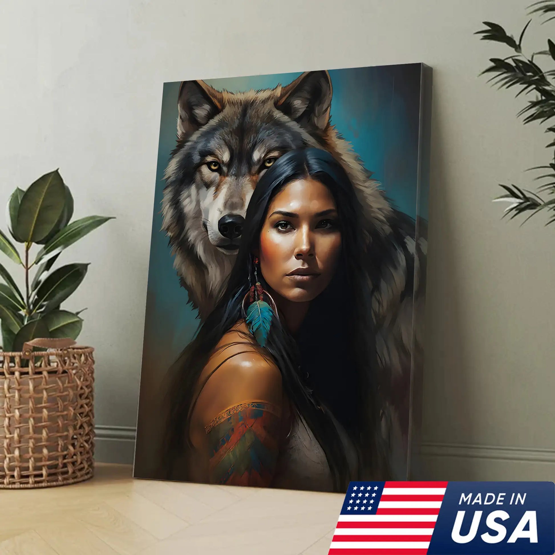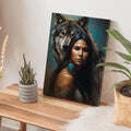 Woman with Wolf Spirit, Tribal Feather Canvas Decor