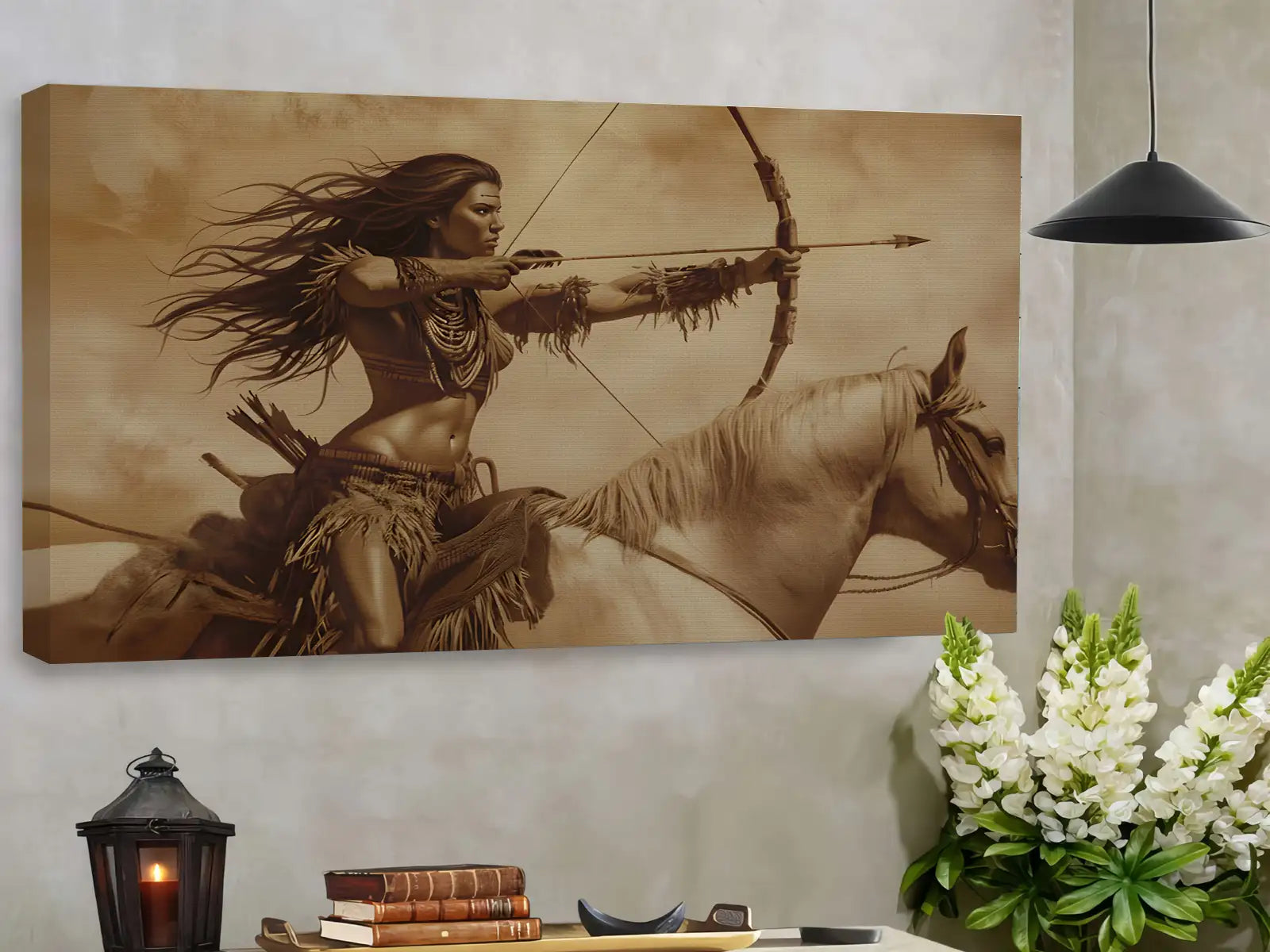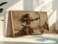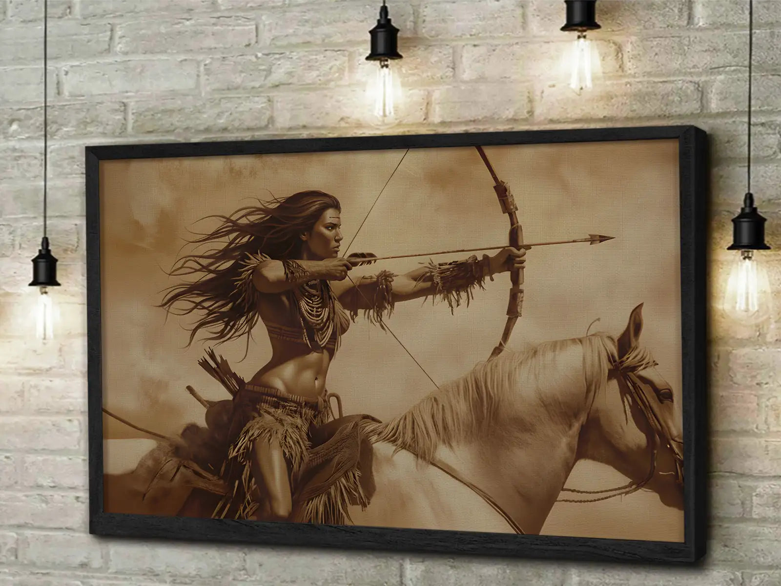 This powerful sepia wall art captures the spirit of a Native American warrior woman riding fearlessly on horseback, bow drawn and arrow ready. The artwork reflects strength, resilience, and deep connection to nature, portraying a moment of determination frozen in time. Inspired by the bravery of tribal women who defended their people and culture, the design conveys courage and empowerment. The dynamic movement of flowing hair and galloping horse creates an atmosphere of energy and freedom, making it a perfect piece for those who admire boldness and heritage. A stunning statement for home or office walls.