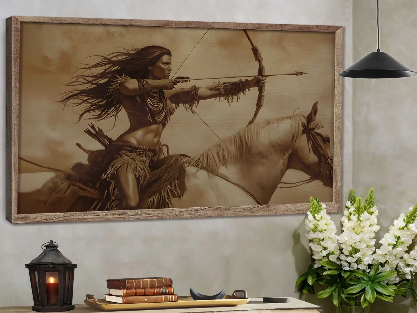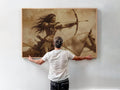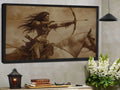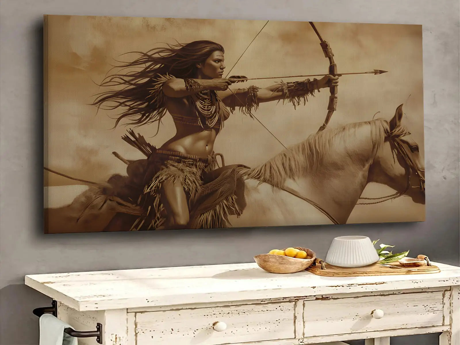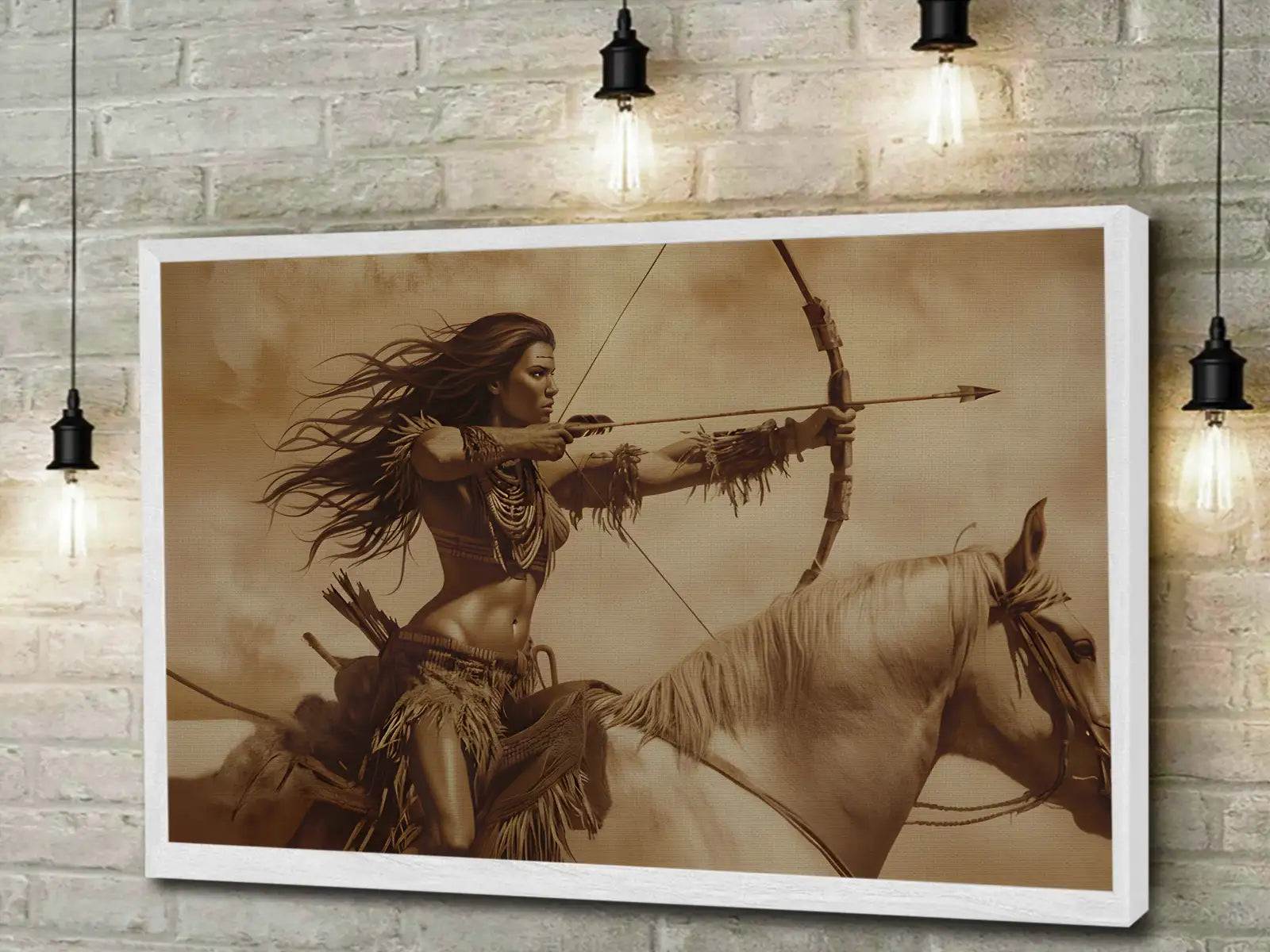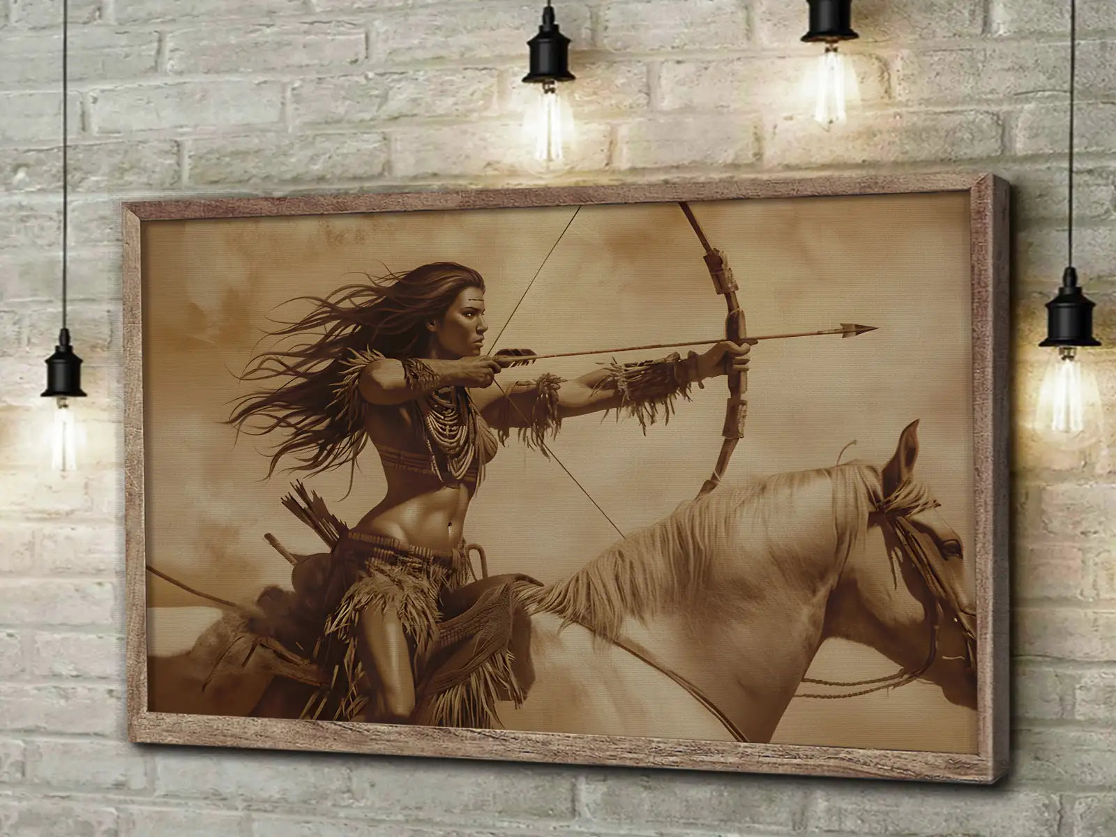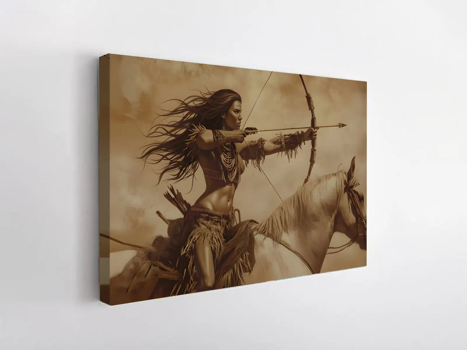 Warrior Woman On Horseback With Bow Sepia Wall Art Canvas