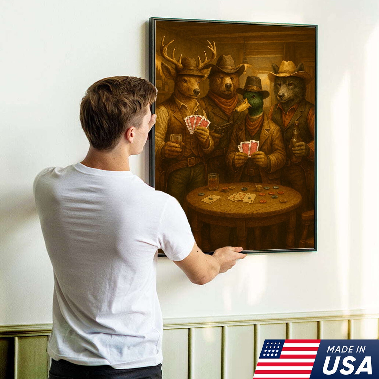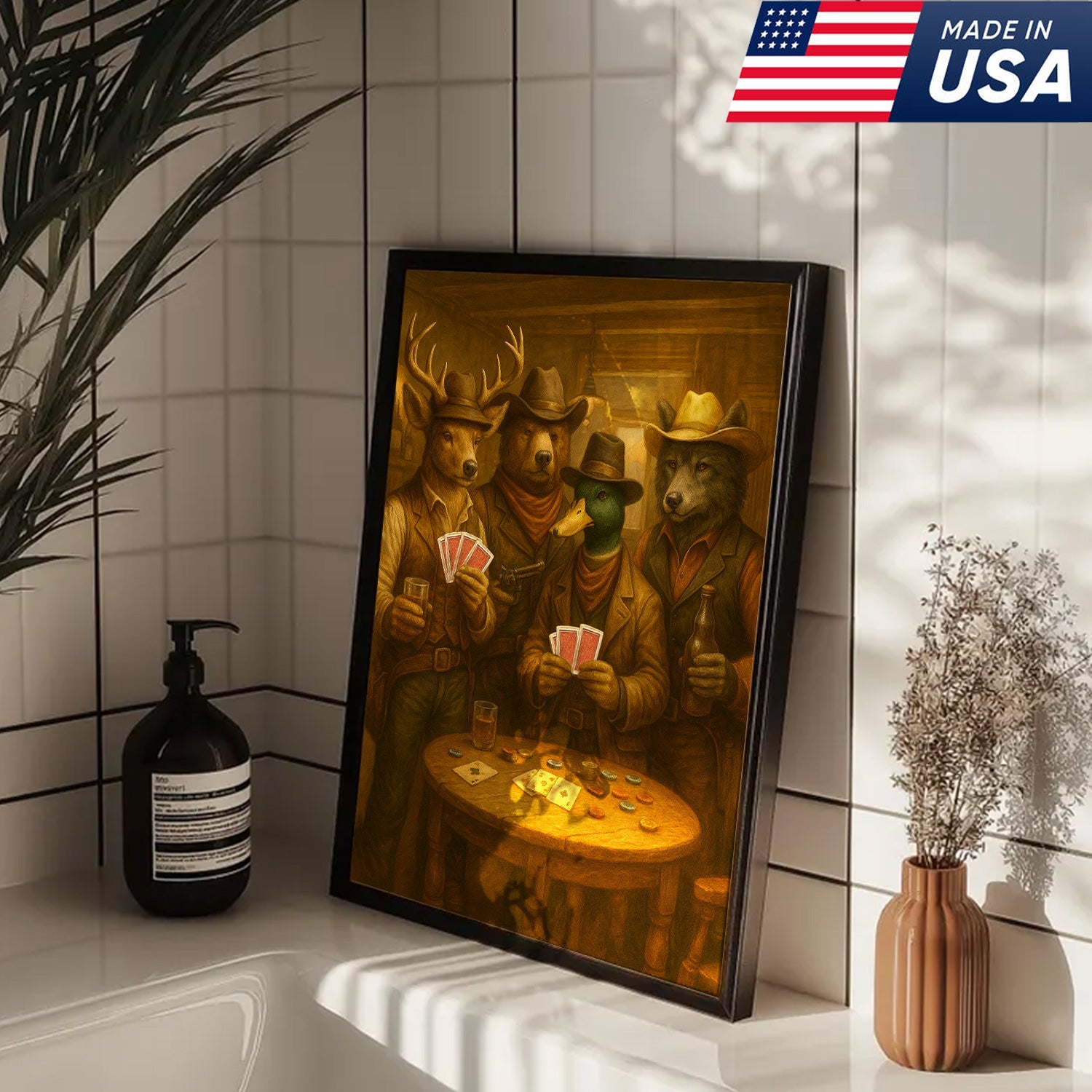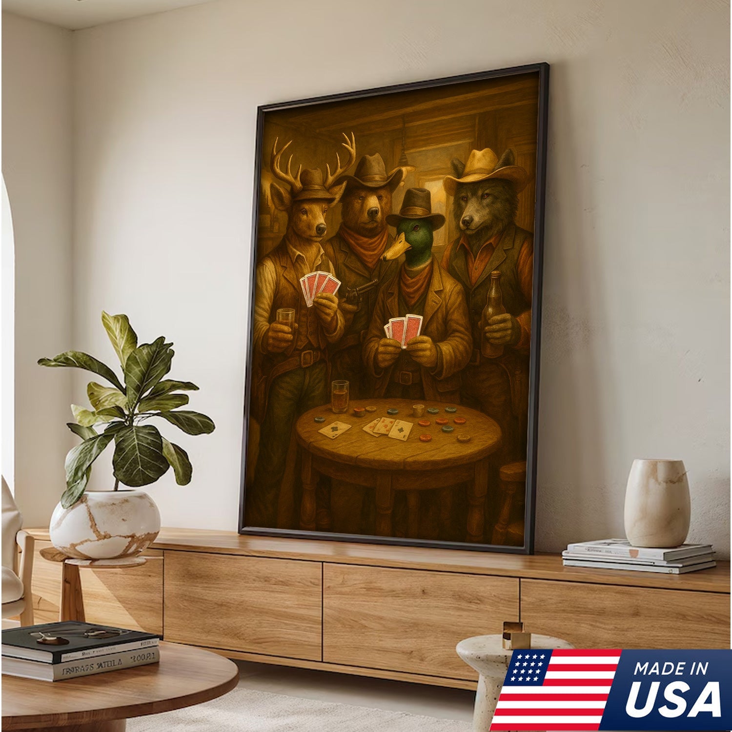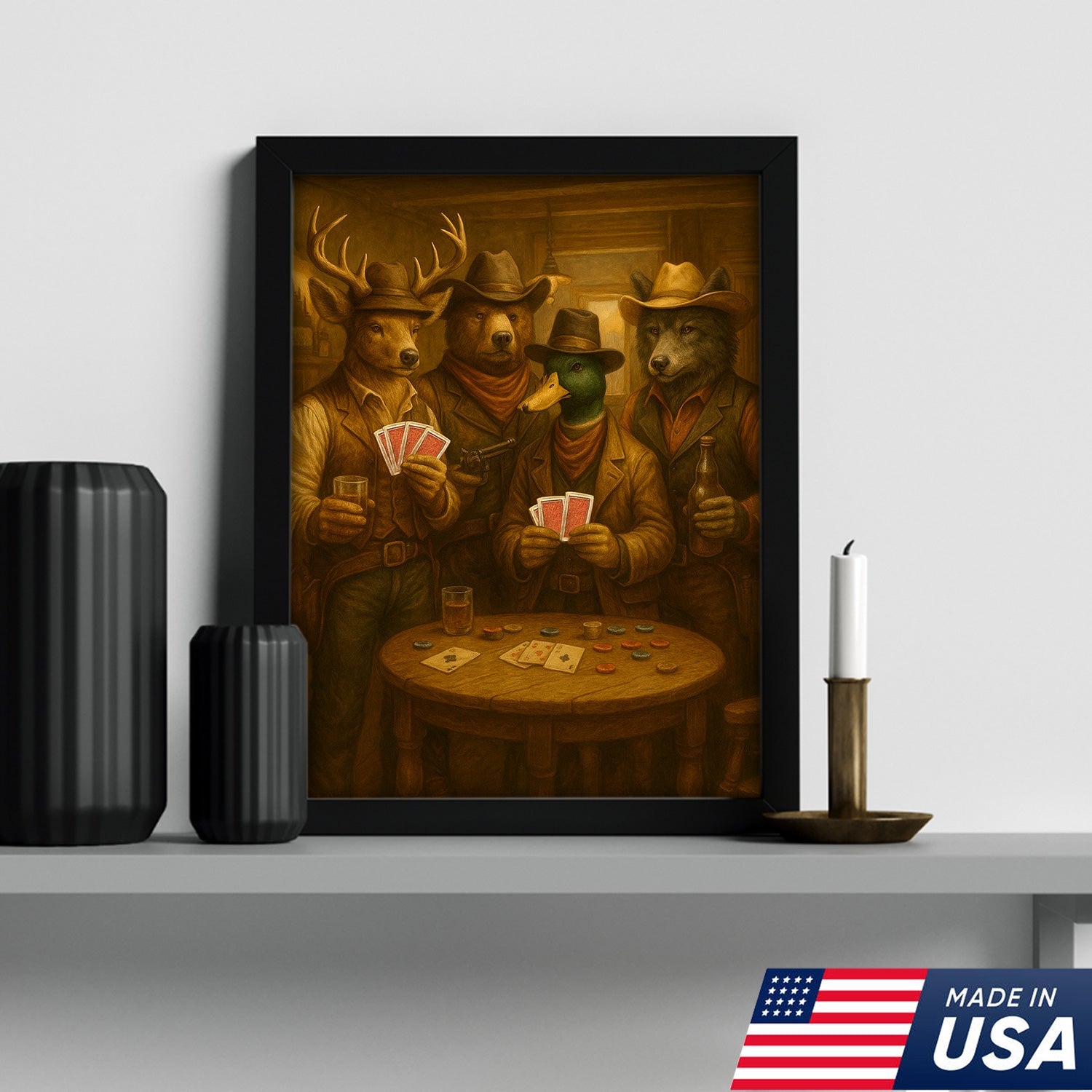 Western Poker Night Animal Canvas Wall Art – Rustic Cowboy Bar Decor for Gamers & Hunters