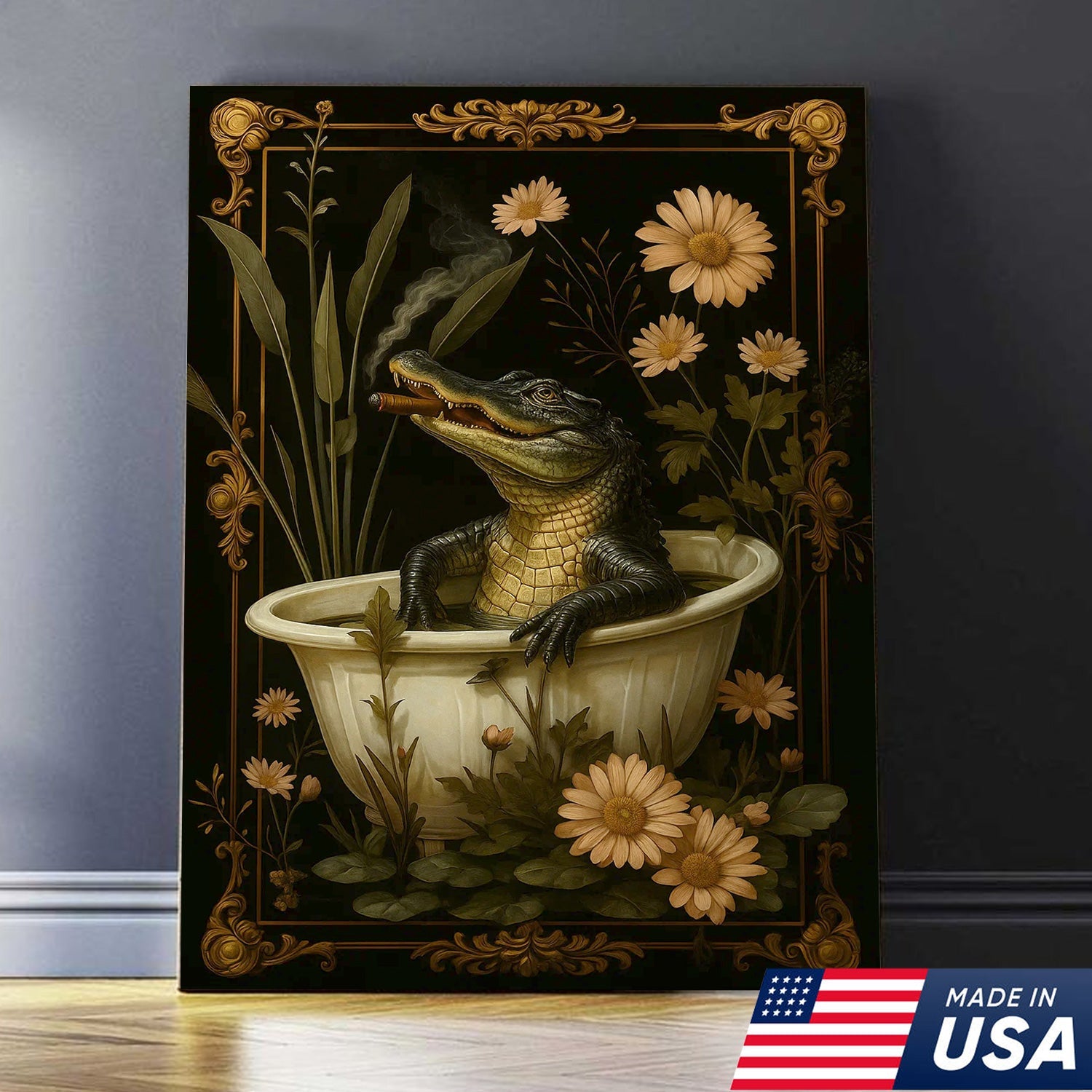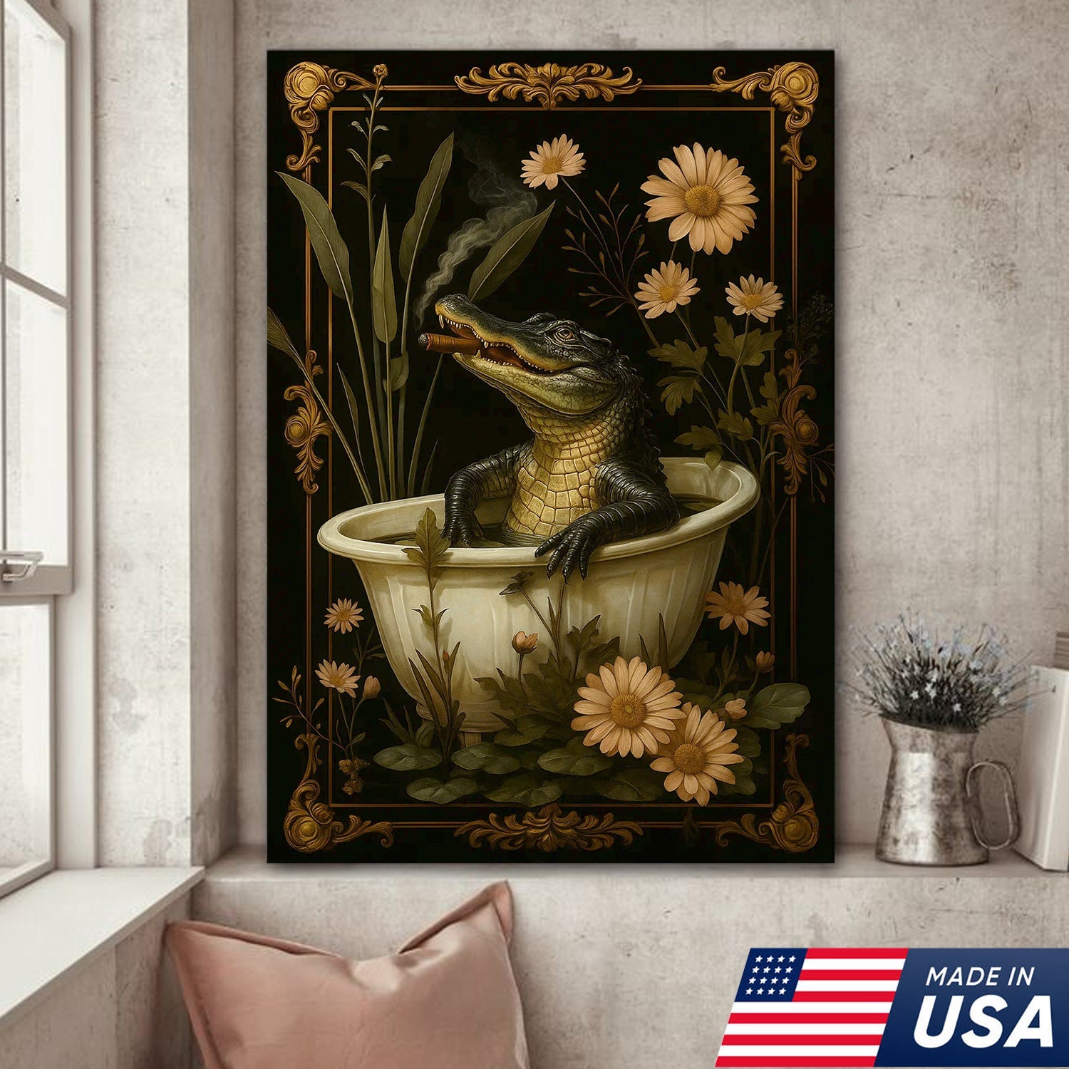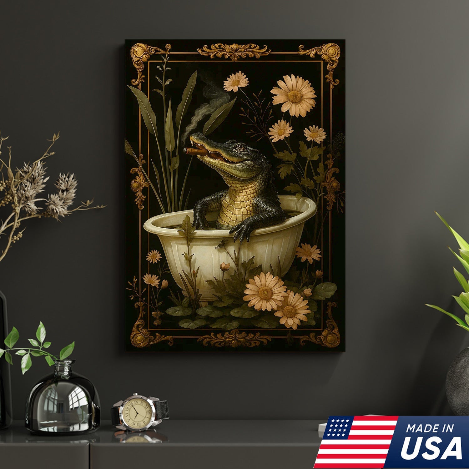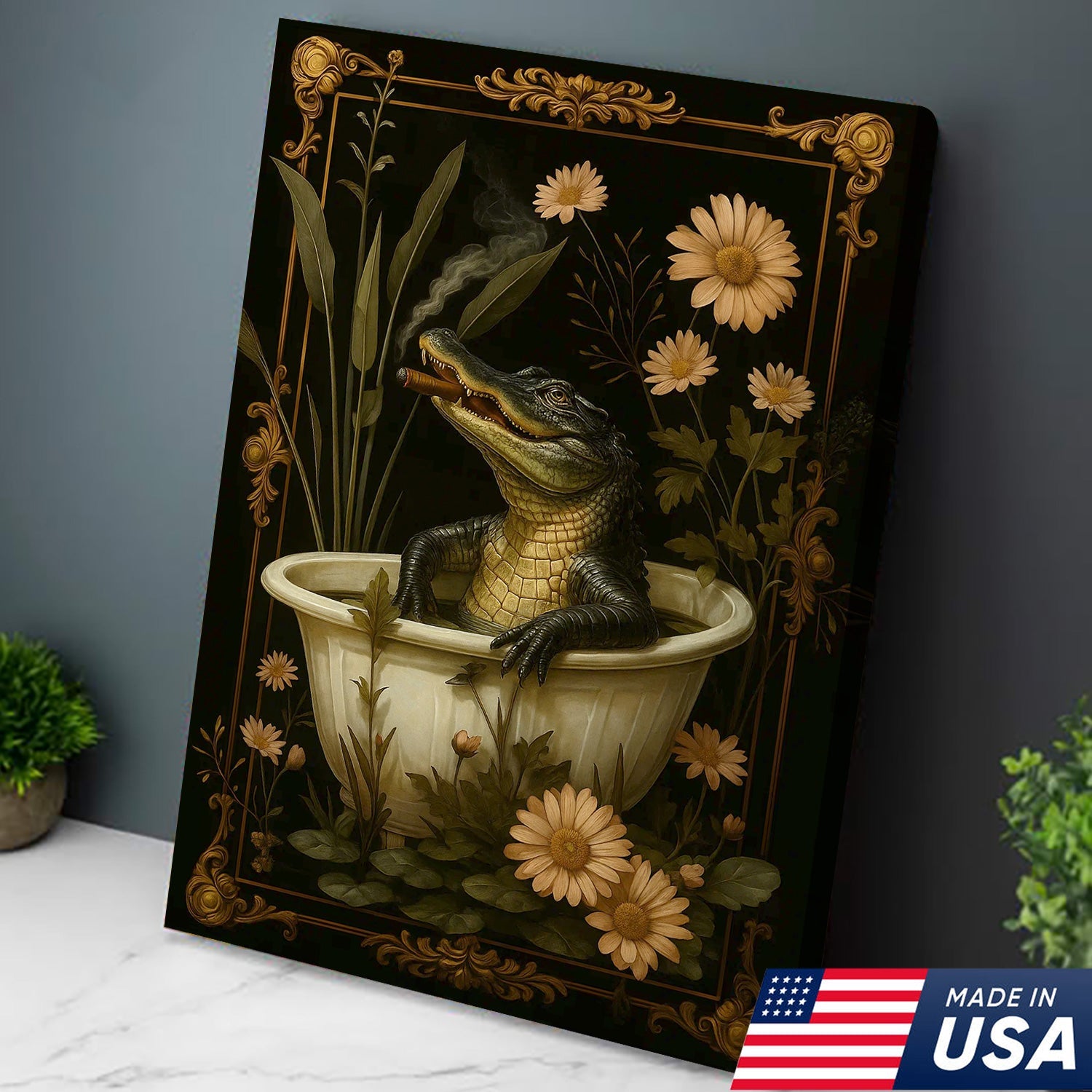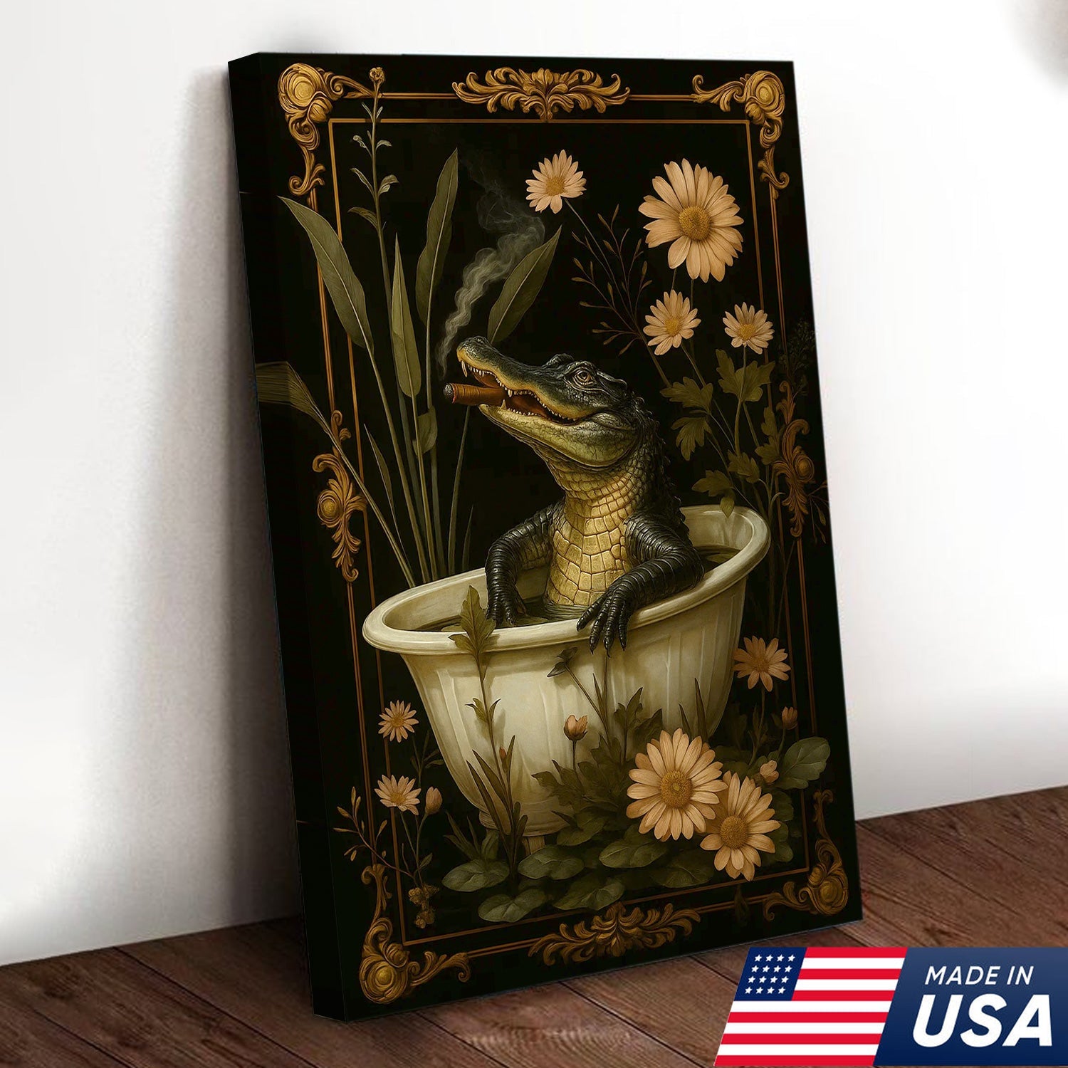 Whimsical Alligator Canvas Wall Art – Funny Gator in Bathtub with Flowers – Rustic Southern Lodge & Bathroom Decor