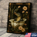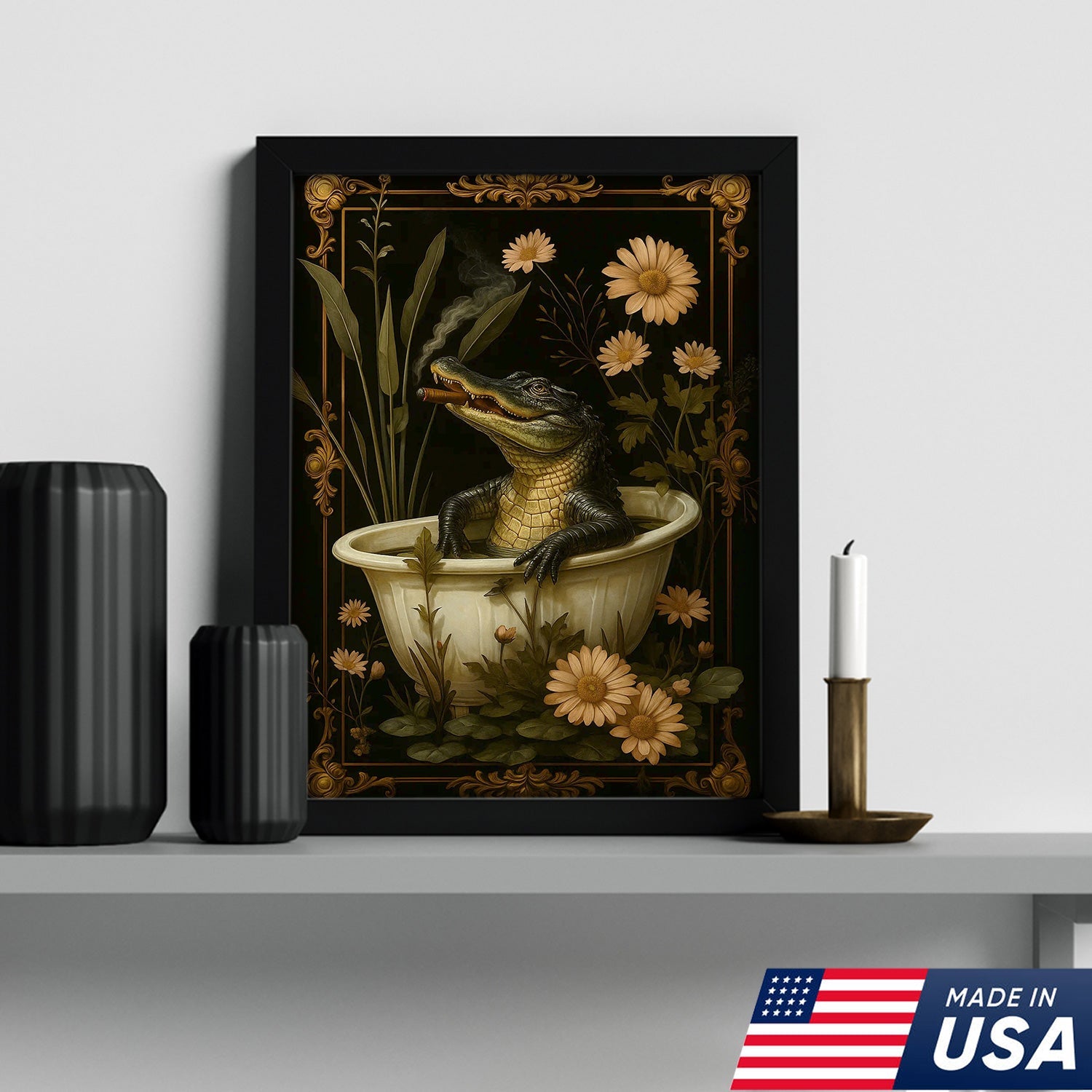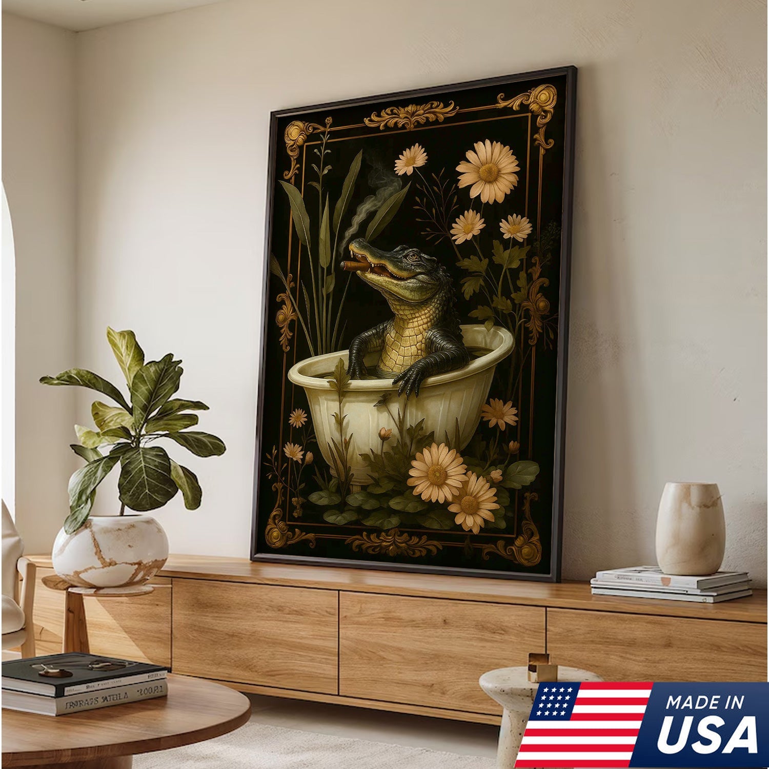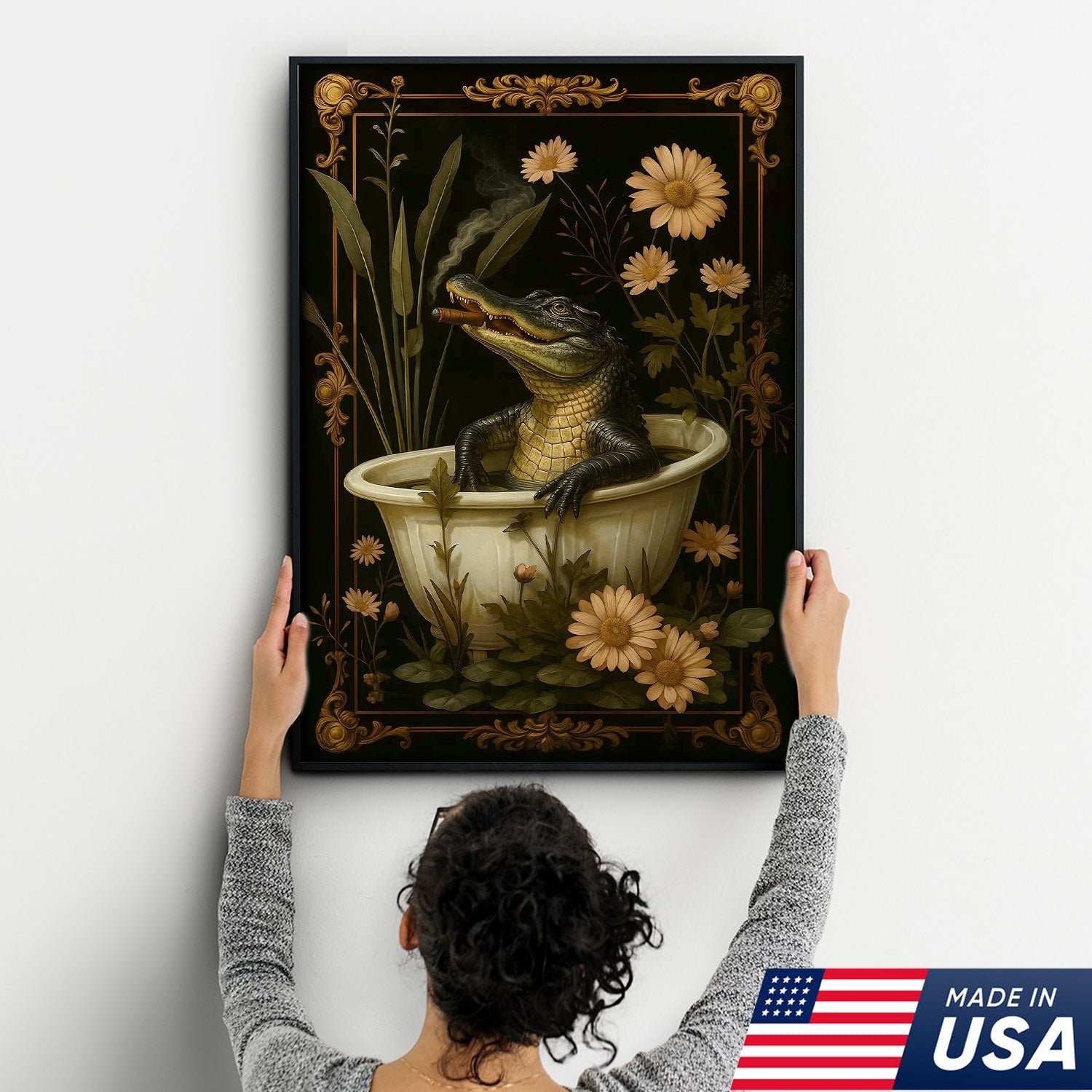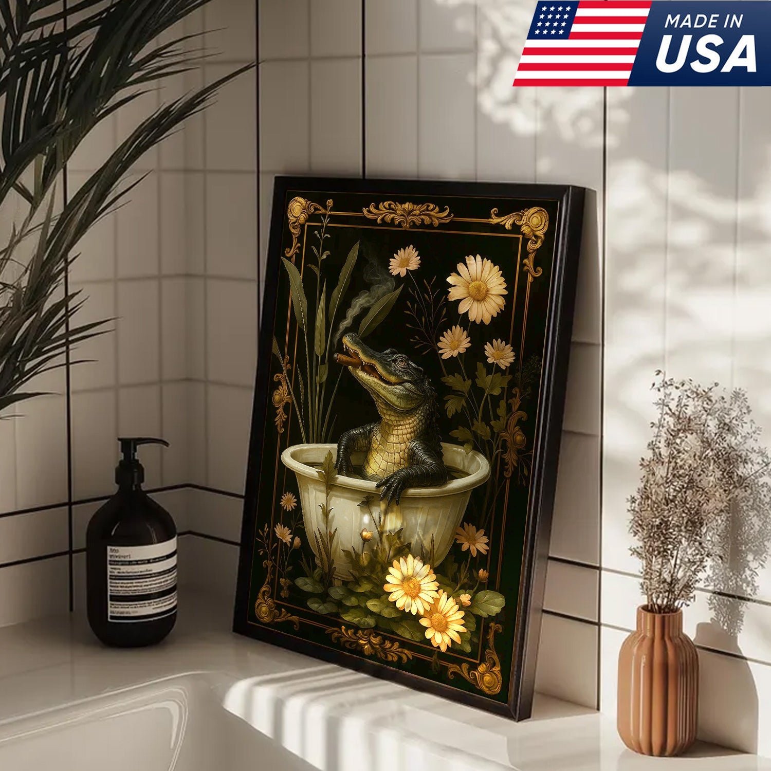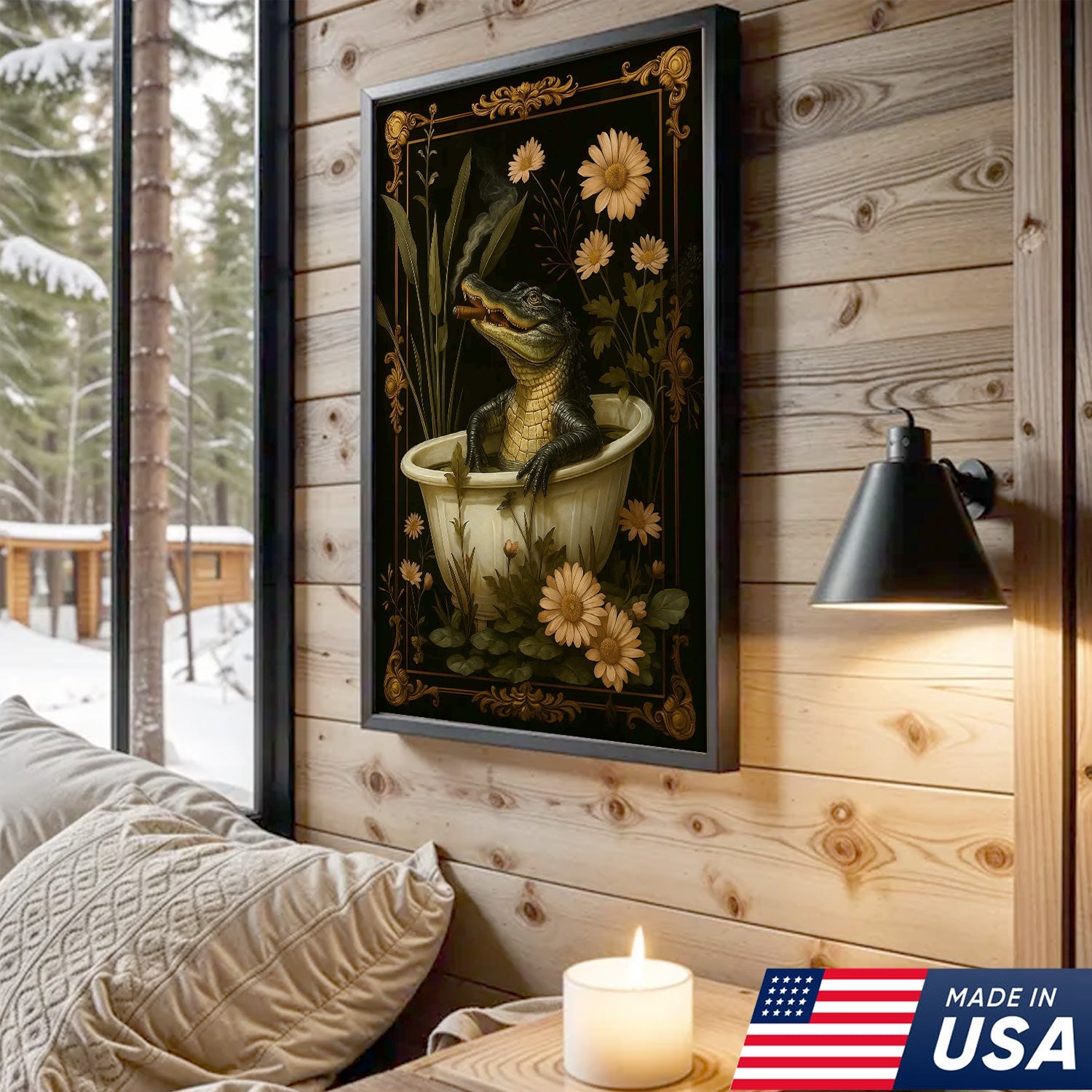 Whimsical Alligator Canvas Wall Art – Funny Gator in Bathtub with Flowers – Rustic Southern Lodge & Bathroom Decor