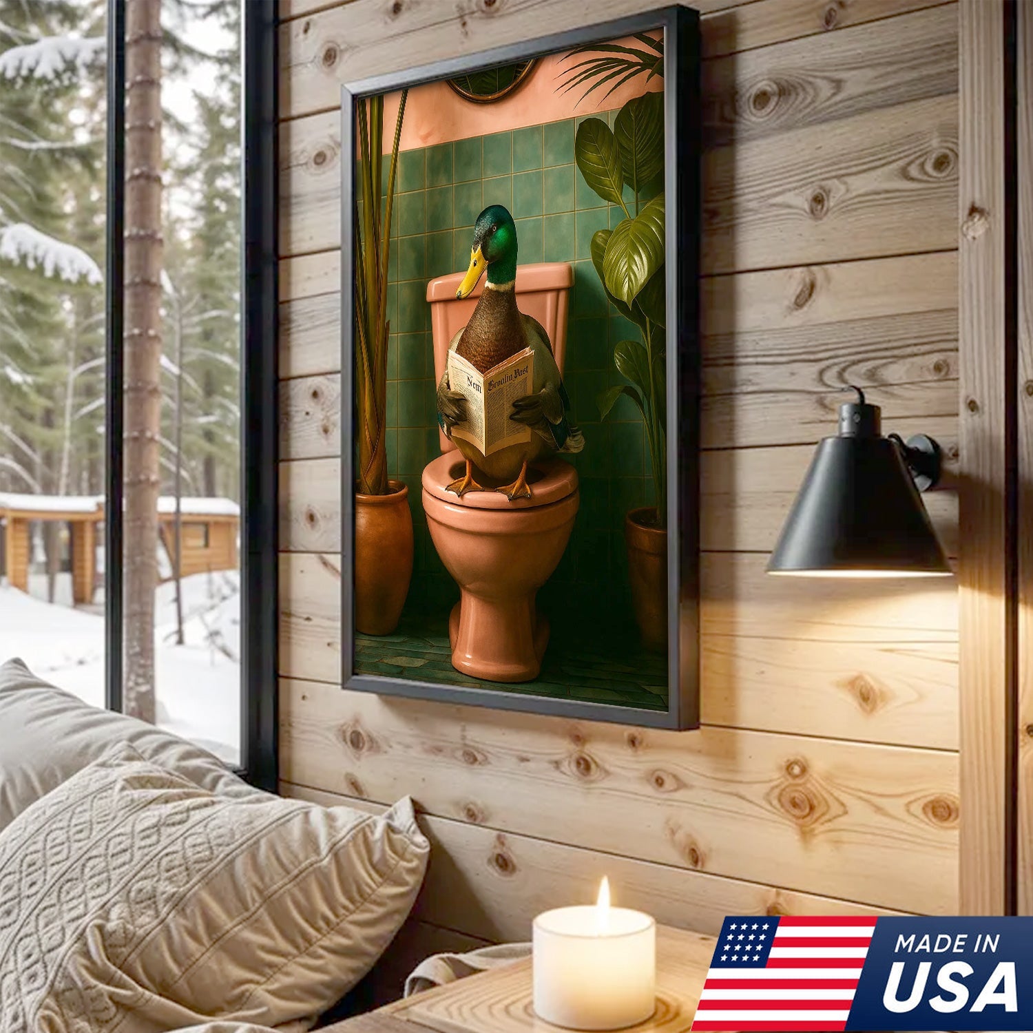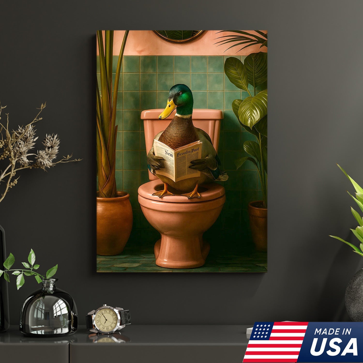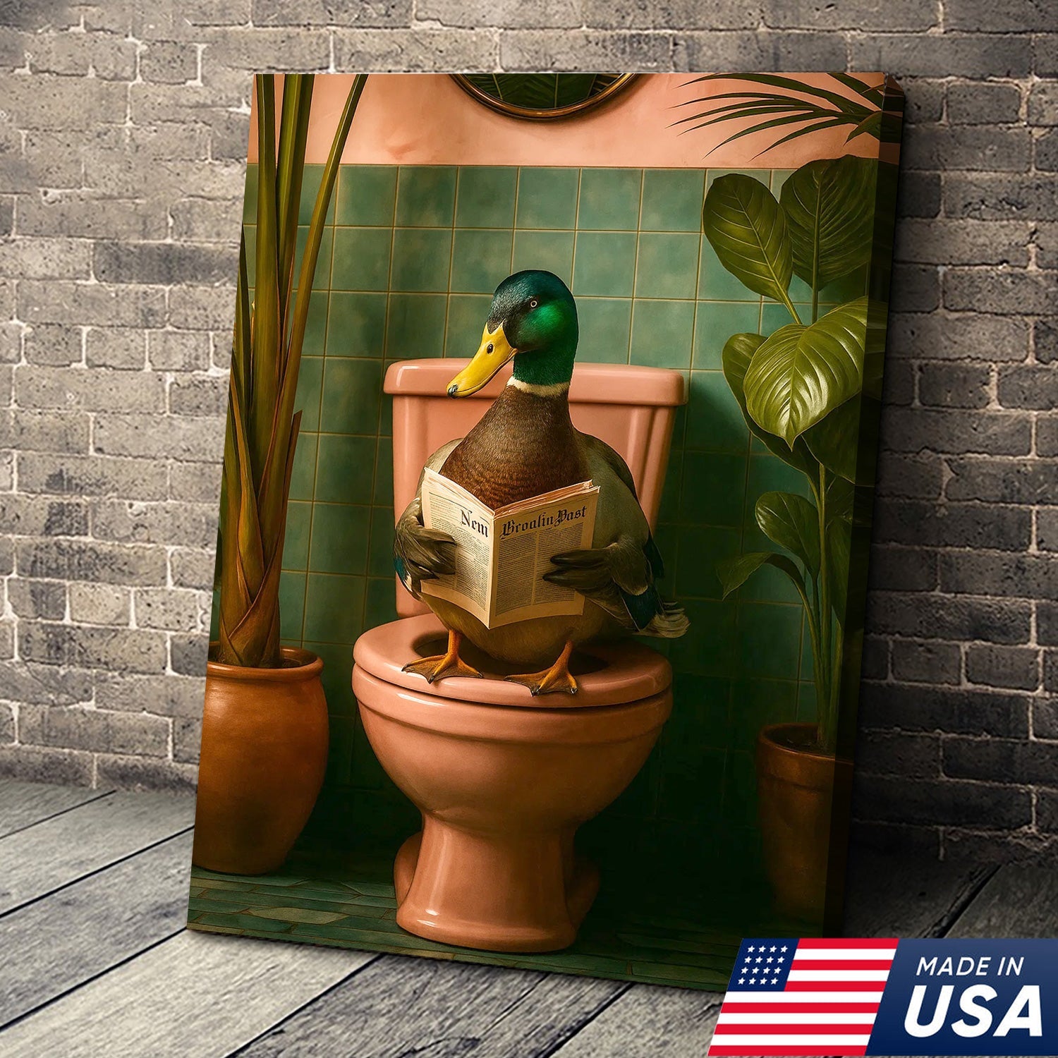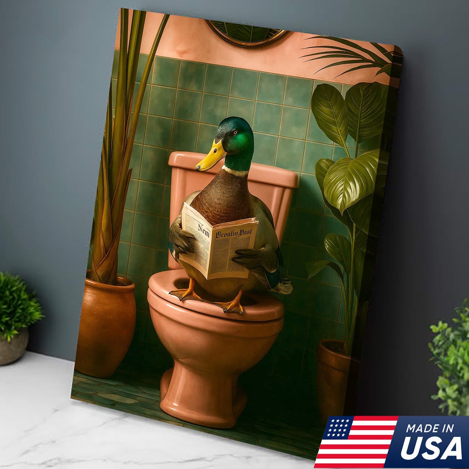 Whimsical Duck Bathroom Canvas Wall Art – Funny Rustic Lodge Decor – Mallard Reading Humor Print