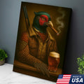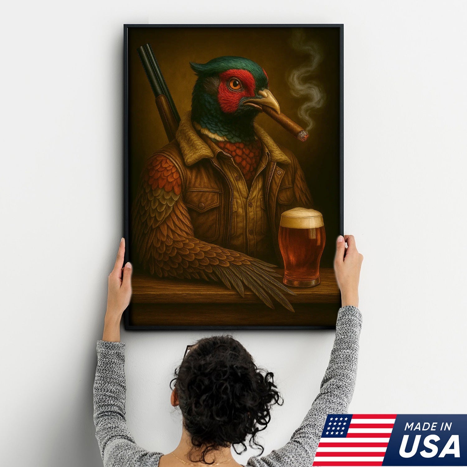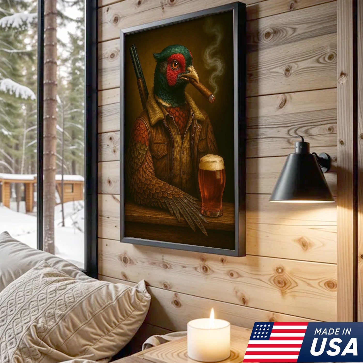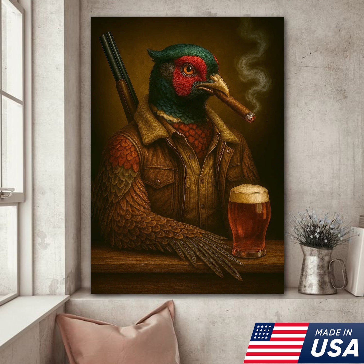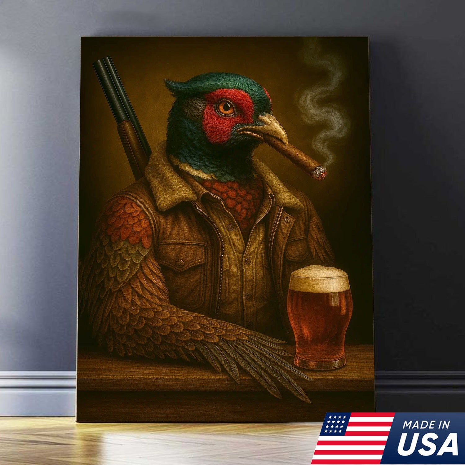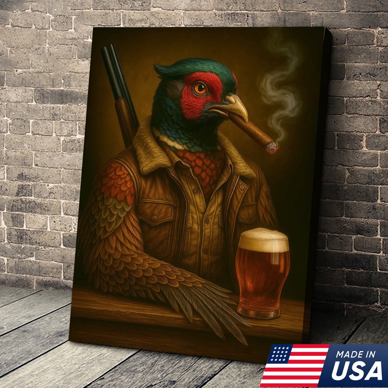 Wild Pheasant Canvas Wall Art – Surreal Hunter Portrait with Beer Glass, Bold Rustic Decor