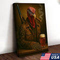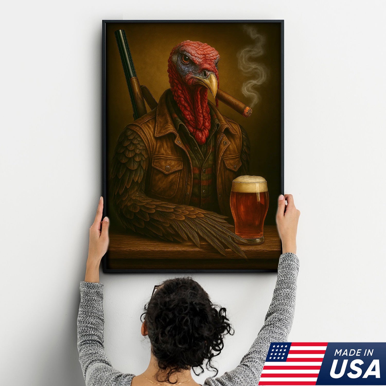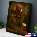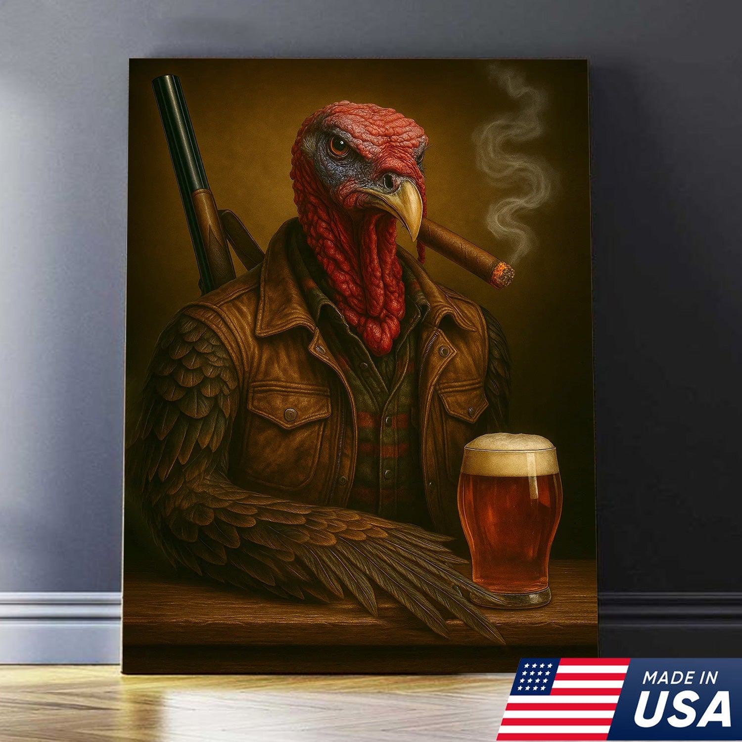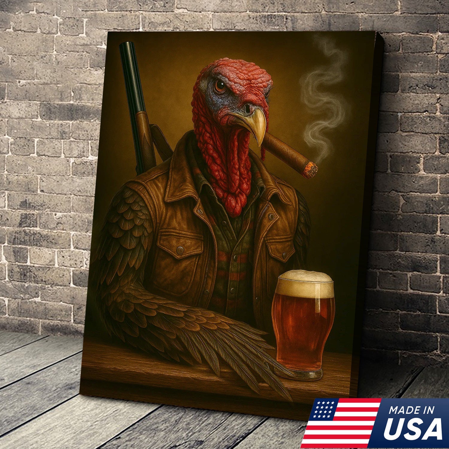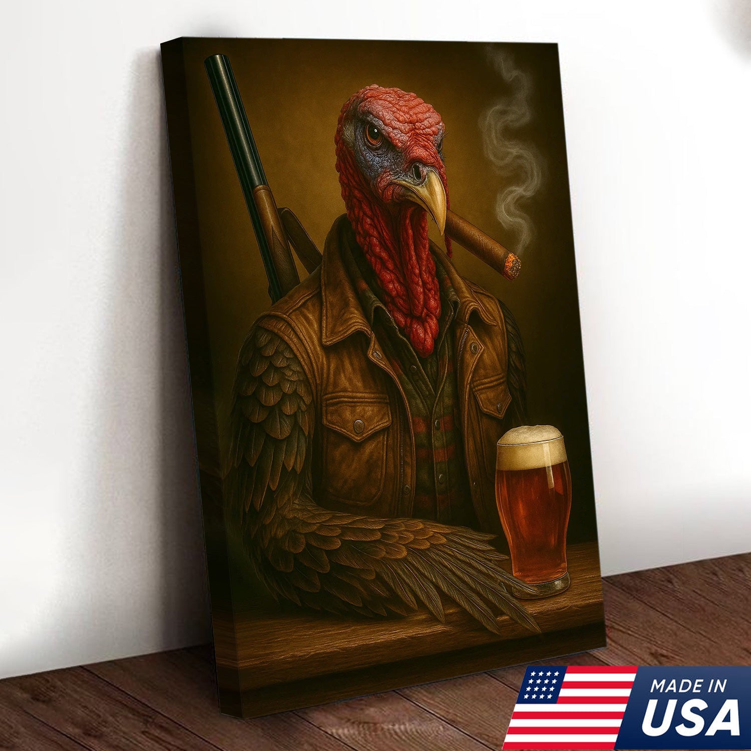 Wild Turkey Canvas Wall Art – Surreal Hunter Portrait with Beer Glass, Rustic Lodge Decor